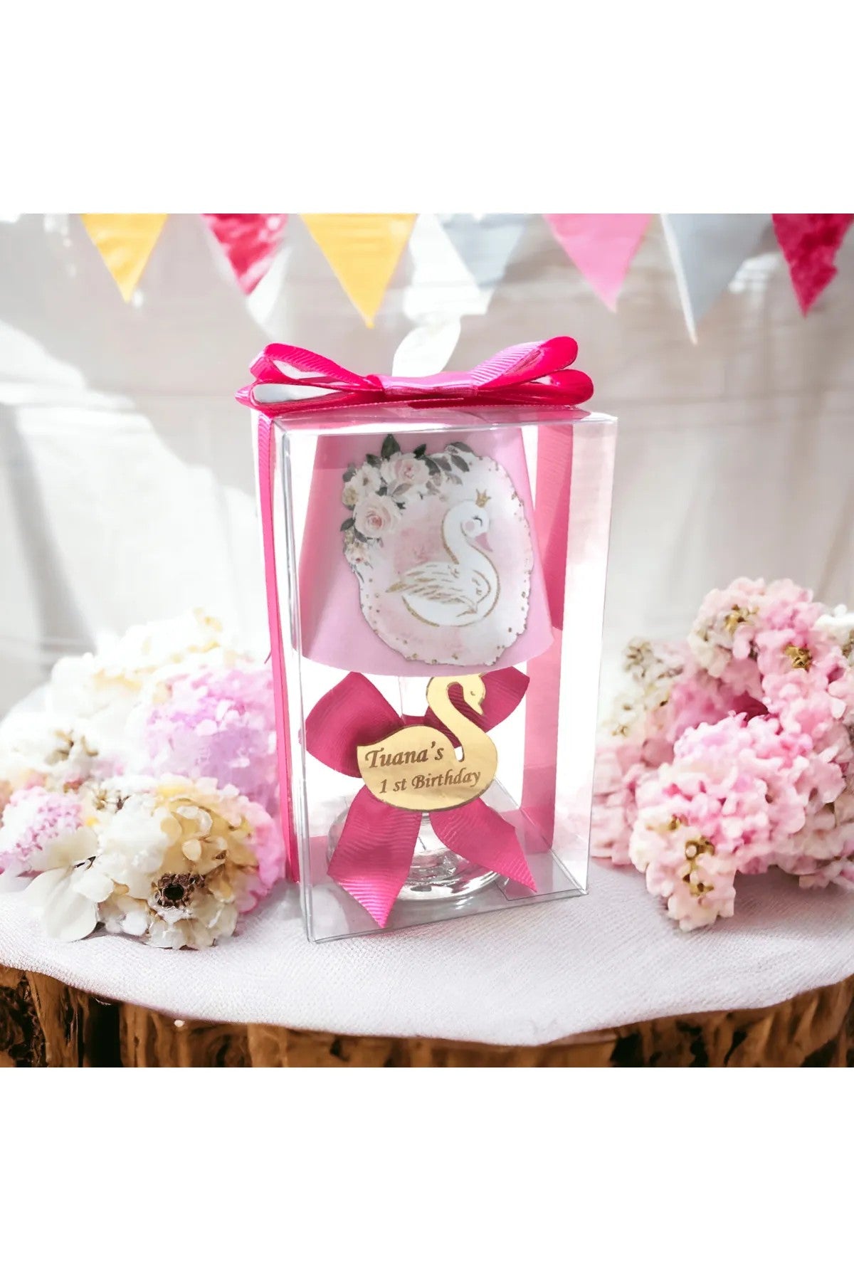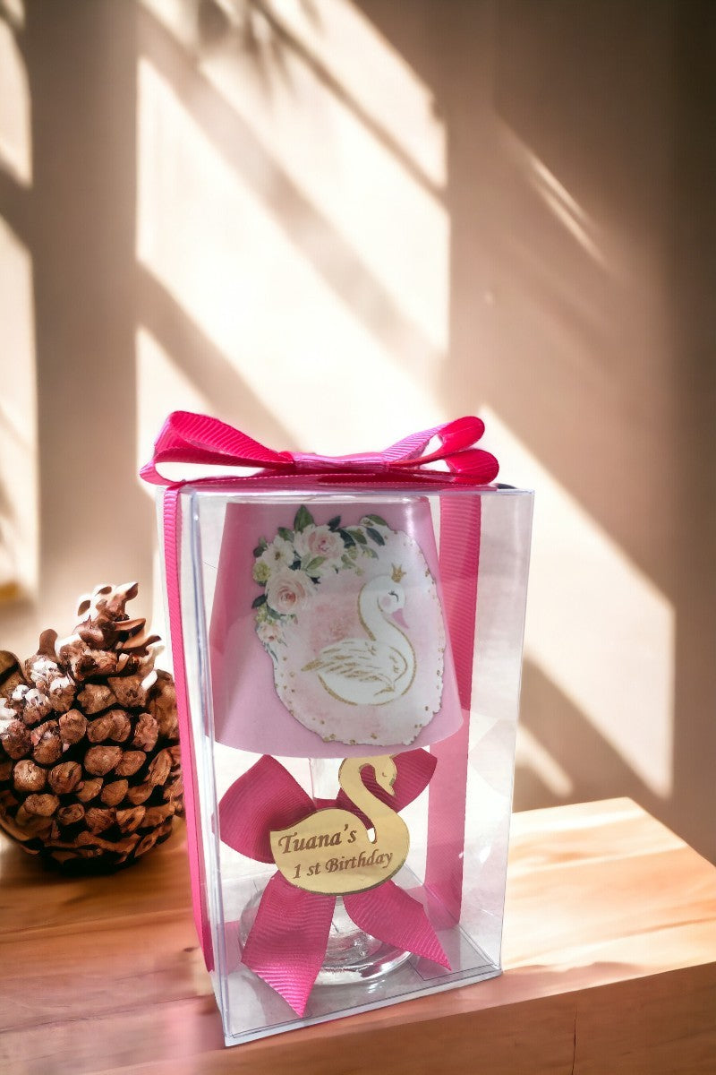 Birth, birthday, mevlid and circumcision gift baby special lampshade candle holder.; It is 7x7 cm wide and 12 cm long.; The bottom is glass and the inside is filled with scented candles.; It is covered with a swan concept print on a pink background on a special material.; It is suitable for use by lighting the candle in the glass. It is also suitable for use with a tealight after the candle inside is finished.; The desired name is written on the gold swan plexiglass at the bottom.; It is prepared in an acetate box with pink ribbon decoration as in the visual.; When you buy 1 piece, it is sent as 10 pieces.; Gold and silver options are available for plexiglass.; Ribbon color may also change.; You need to provide information for the text you want to be written.