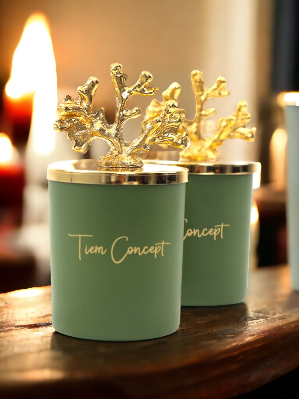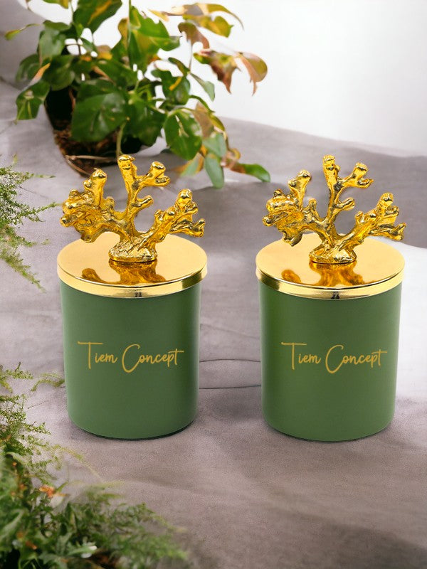 Tiem Concept Decorative Special Design Gold Coral Top Green Tea Scented 2-Piece Green Glass Candle Set