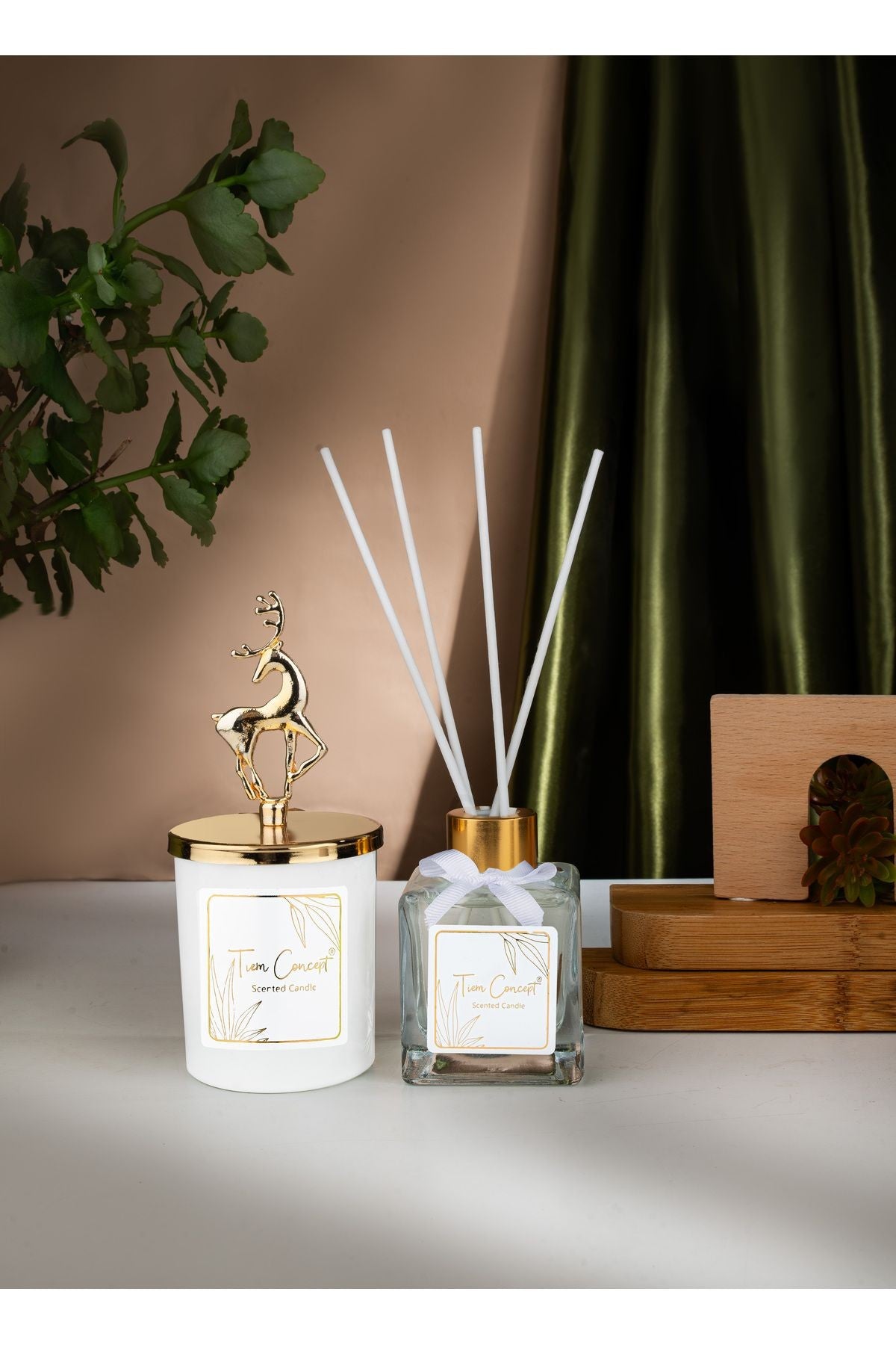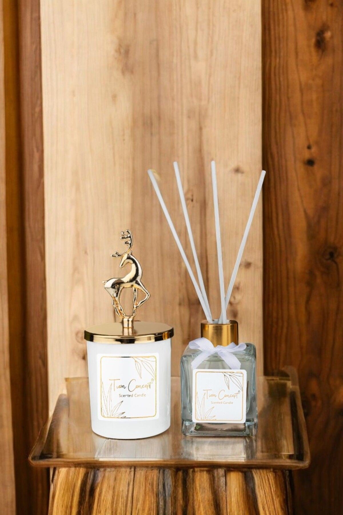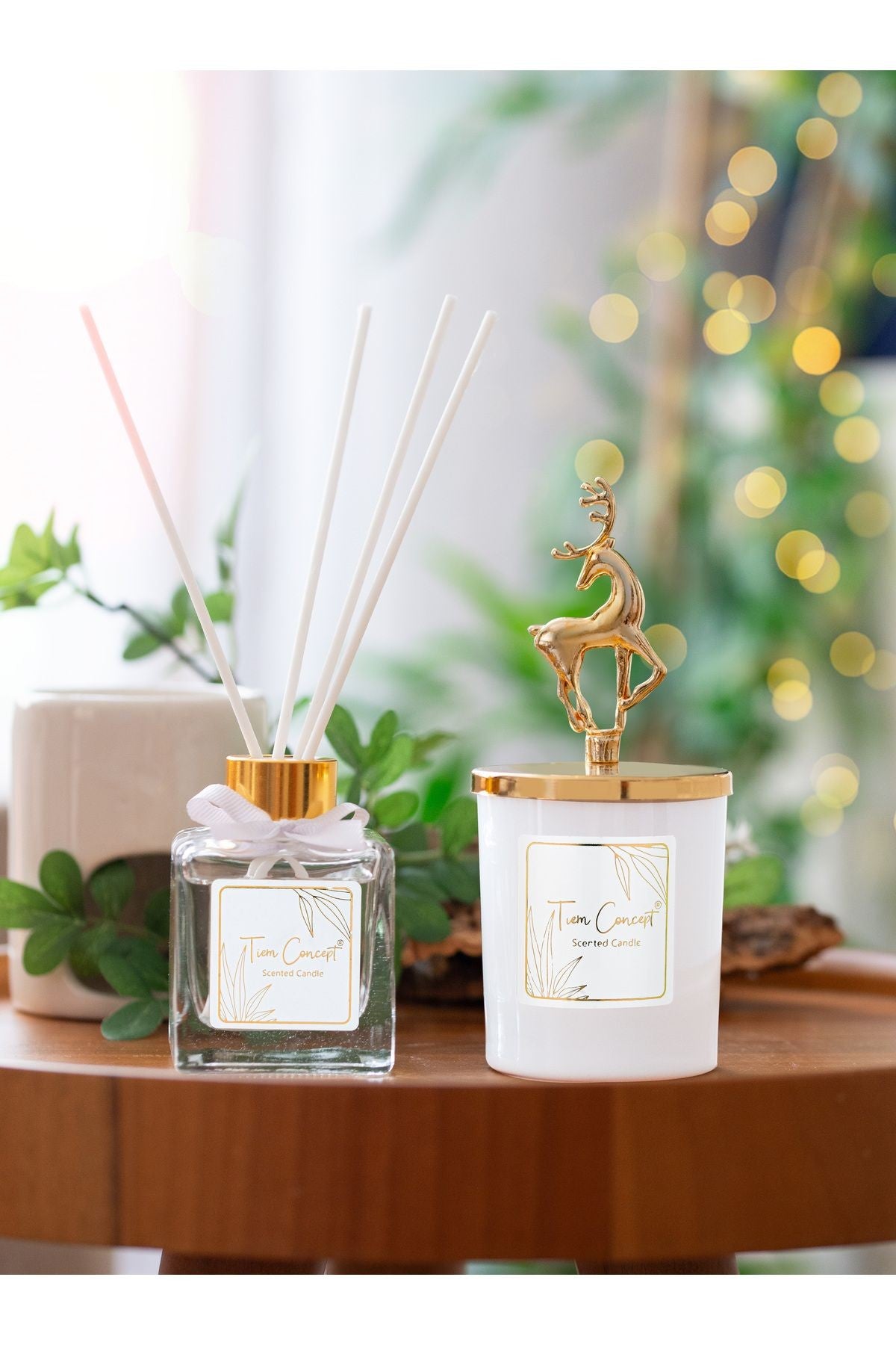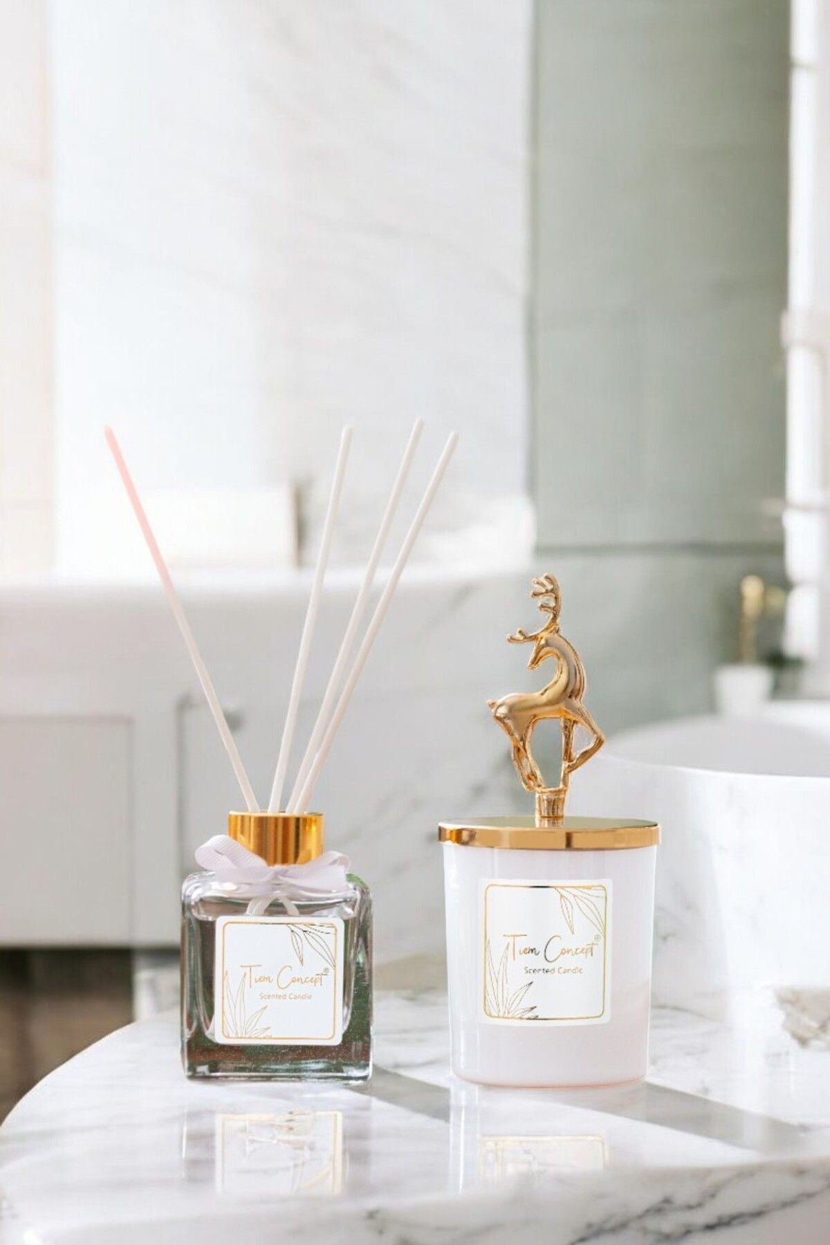 Geyik Başlıklı Gold Detaylı Çubuklu Oda Kokusu 100 ml ve Beyaz Bardak Mum Seti