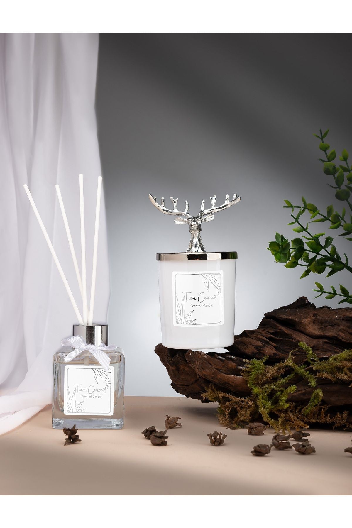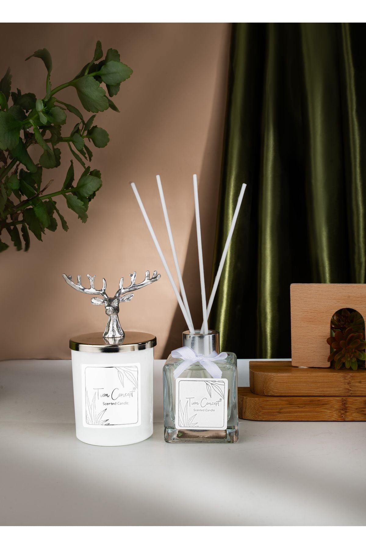 Geyik Başlıklı Gümüş Detaylı Çubuklu Oda Kokusu 100 ml ve Beyaz Bardak Mum Seti