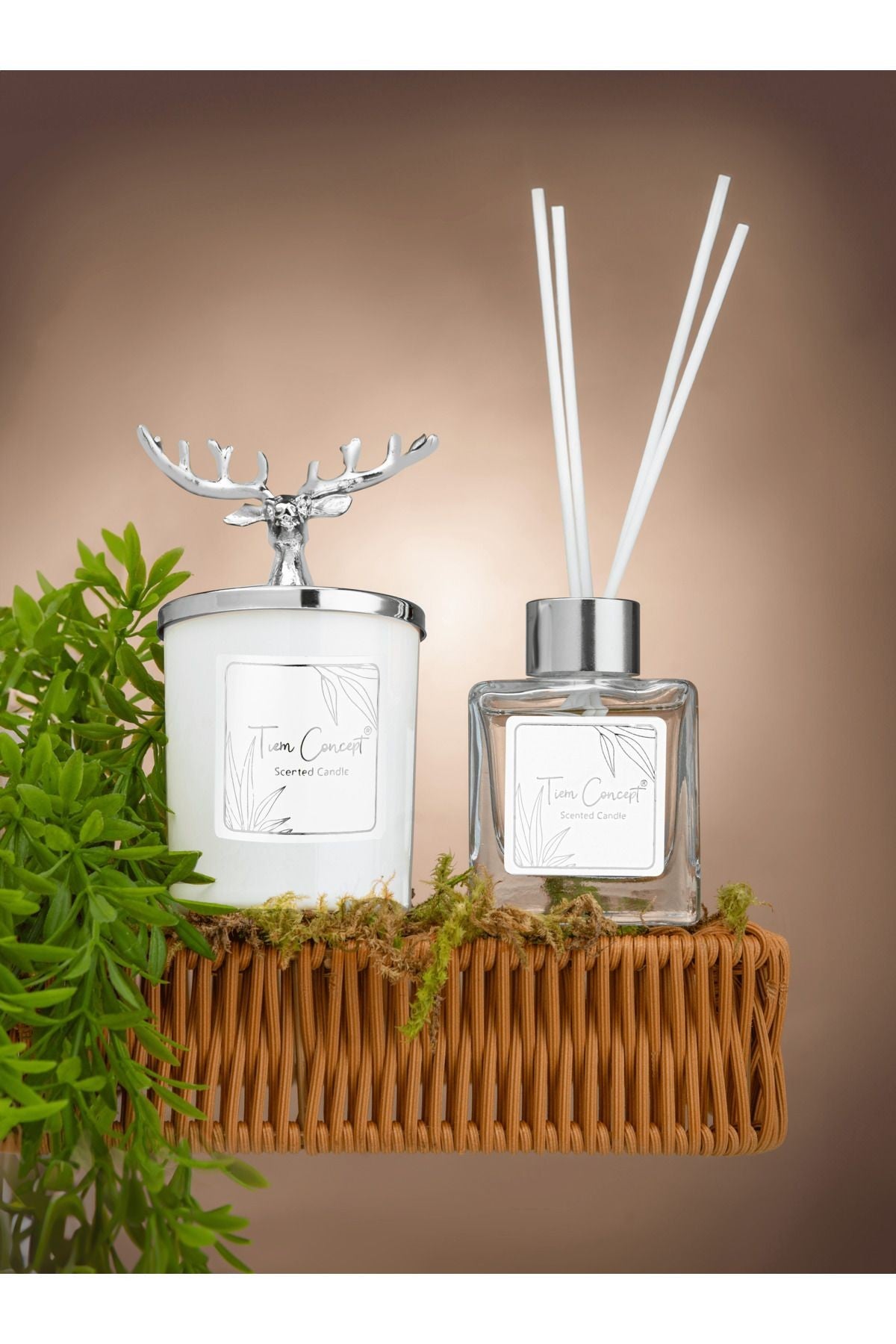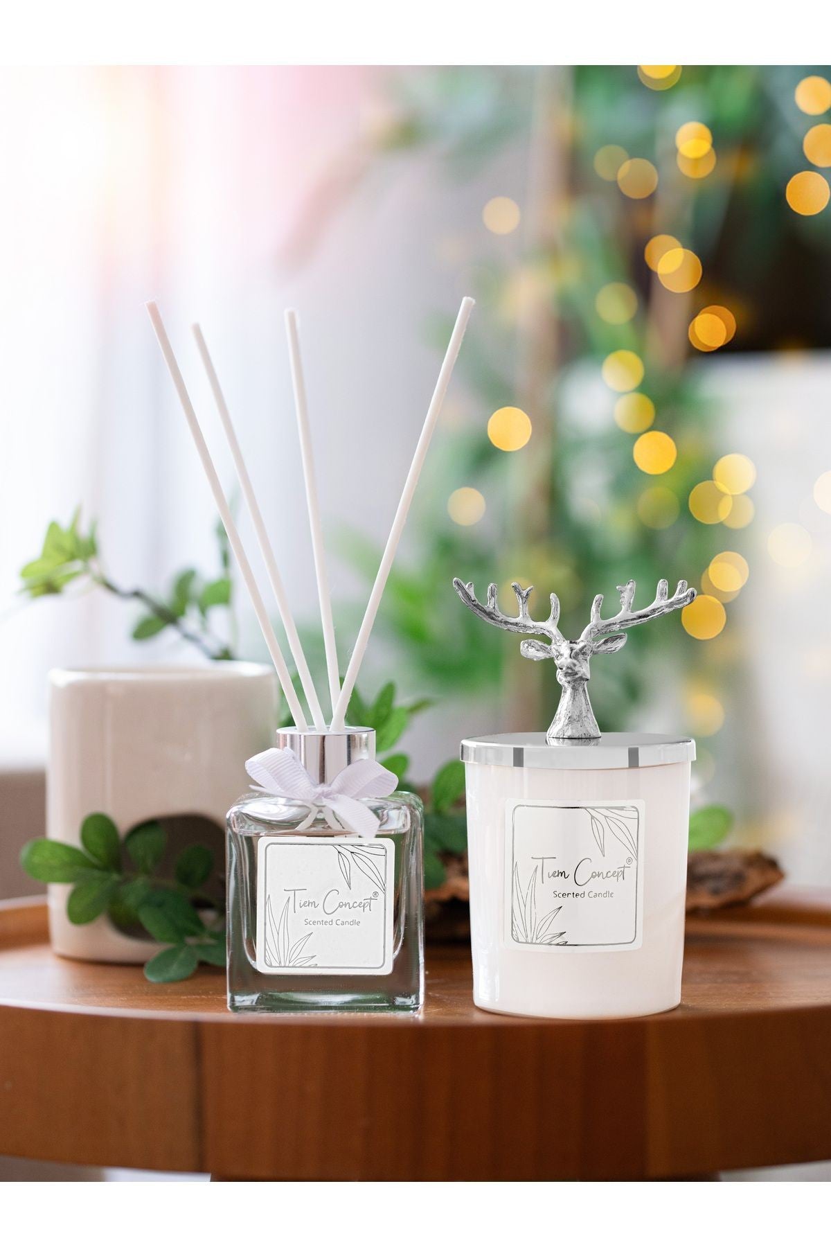 Geyik Başlıklı Gümüş Detaylı Çubuklu Oda Kokusu 100 ml ve Beyaz Bardak Mum Seti