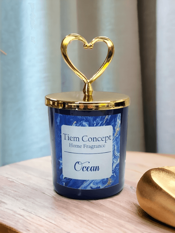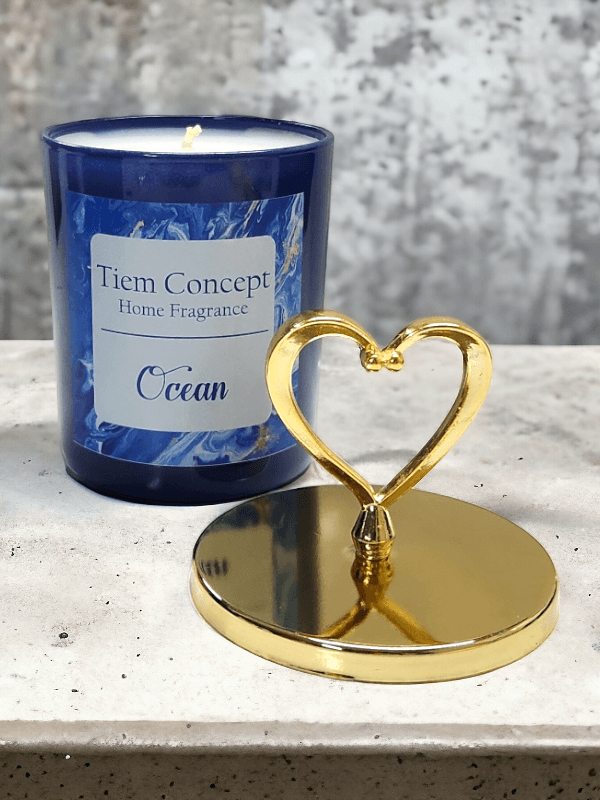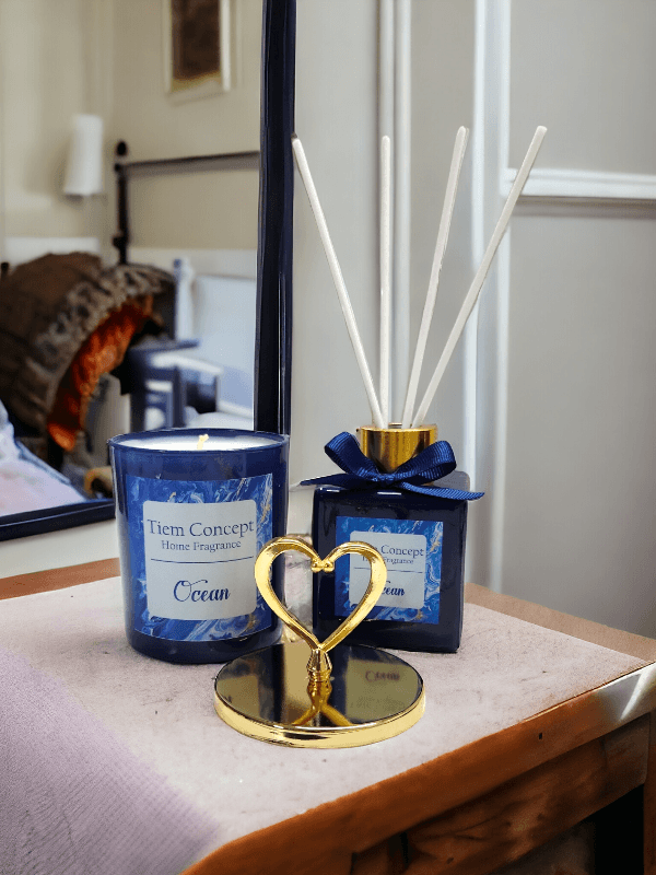 Kalp Gold Başlıklı Okyanus Kokulu Lacivert Bardak Mum ve Oda Kokusu Seti 100 ml