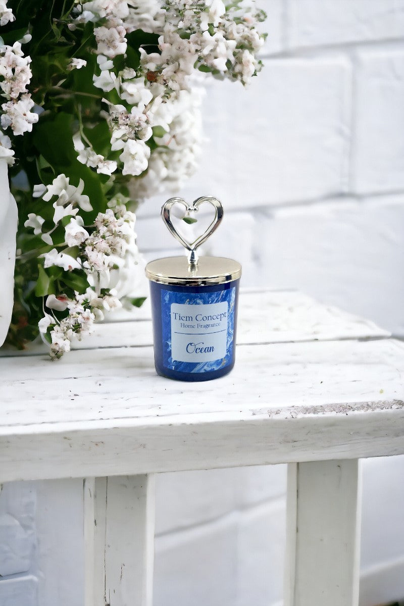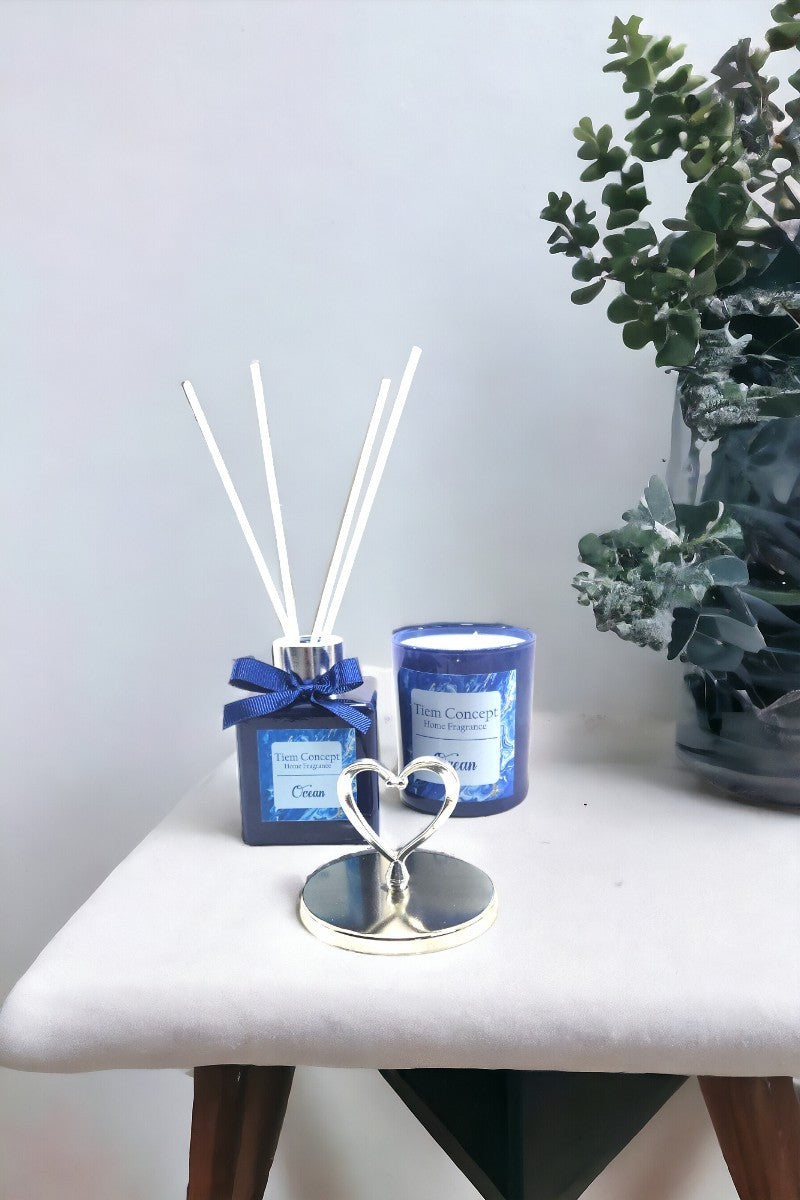 Kalp Gümüş Başlıklı Okyanus Kokulu Lacivert Bardak Mum ve Oda Kokusu Seti 100 ml