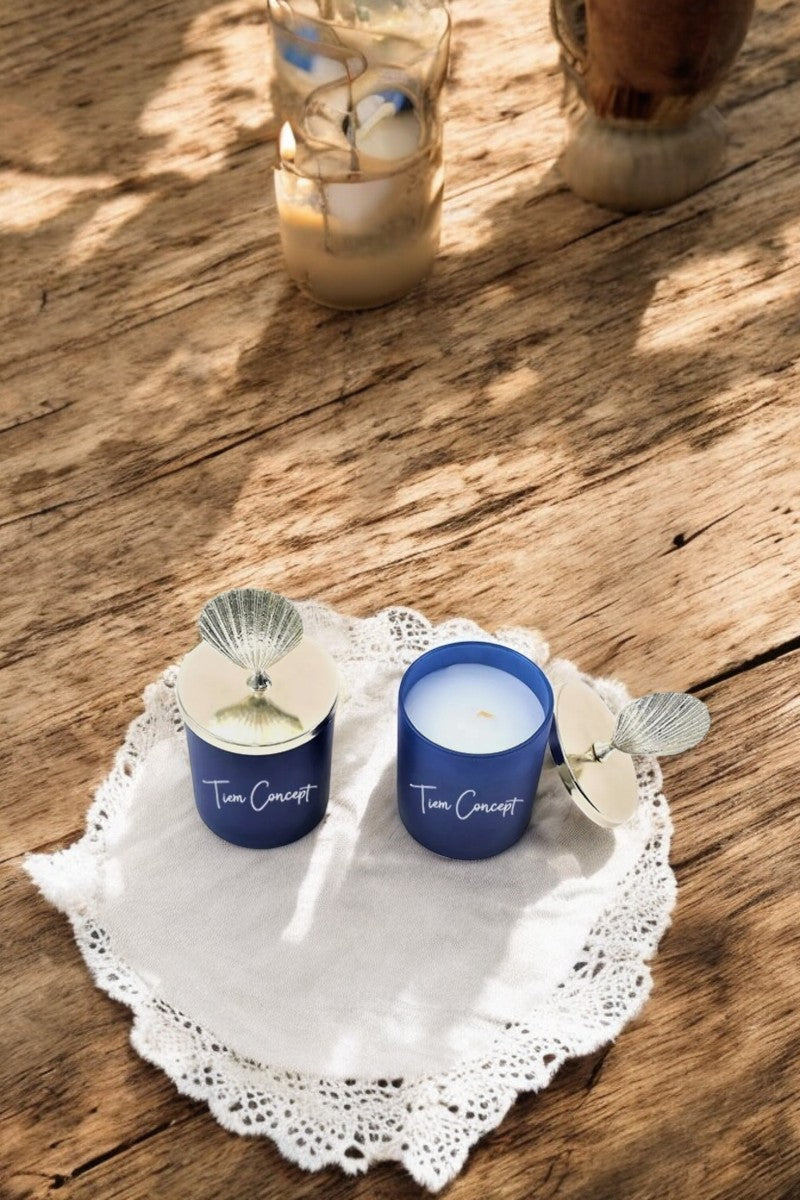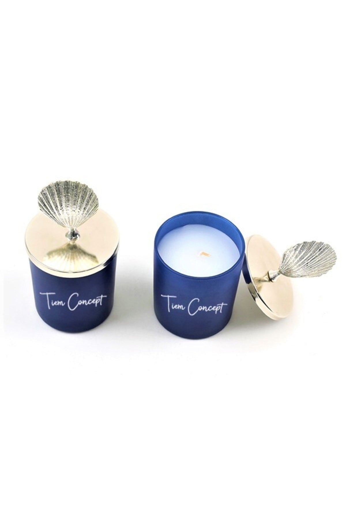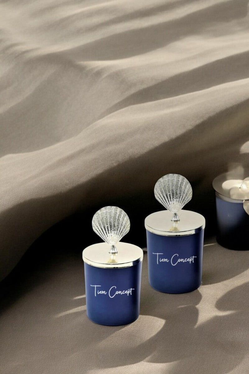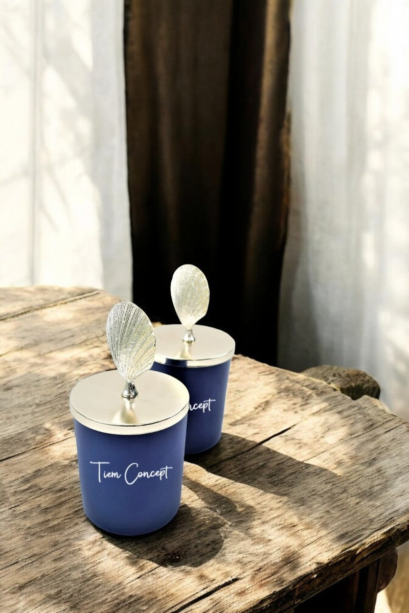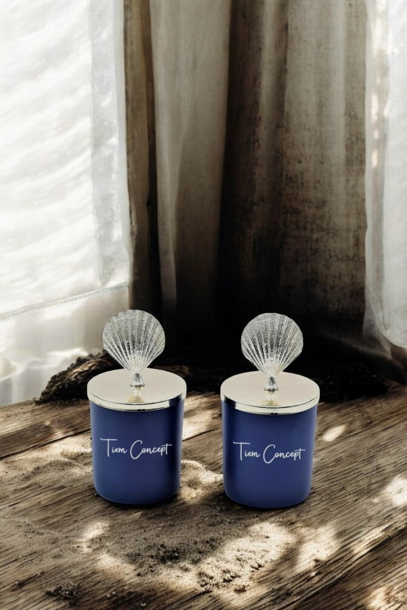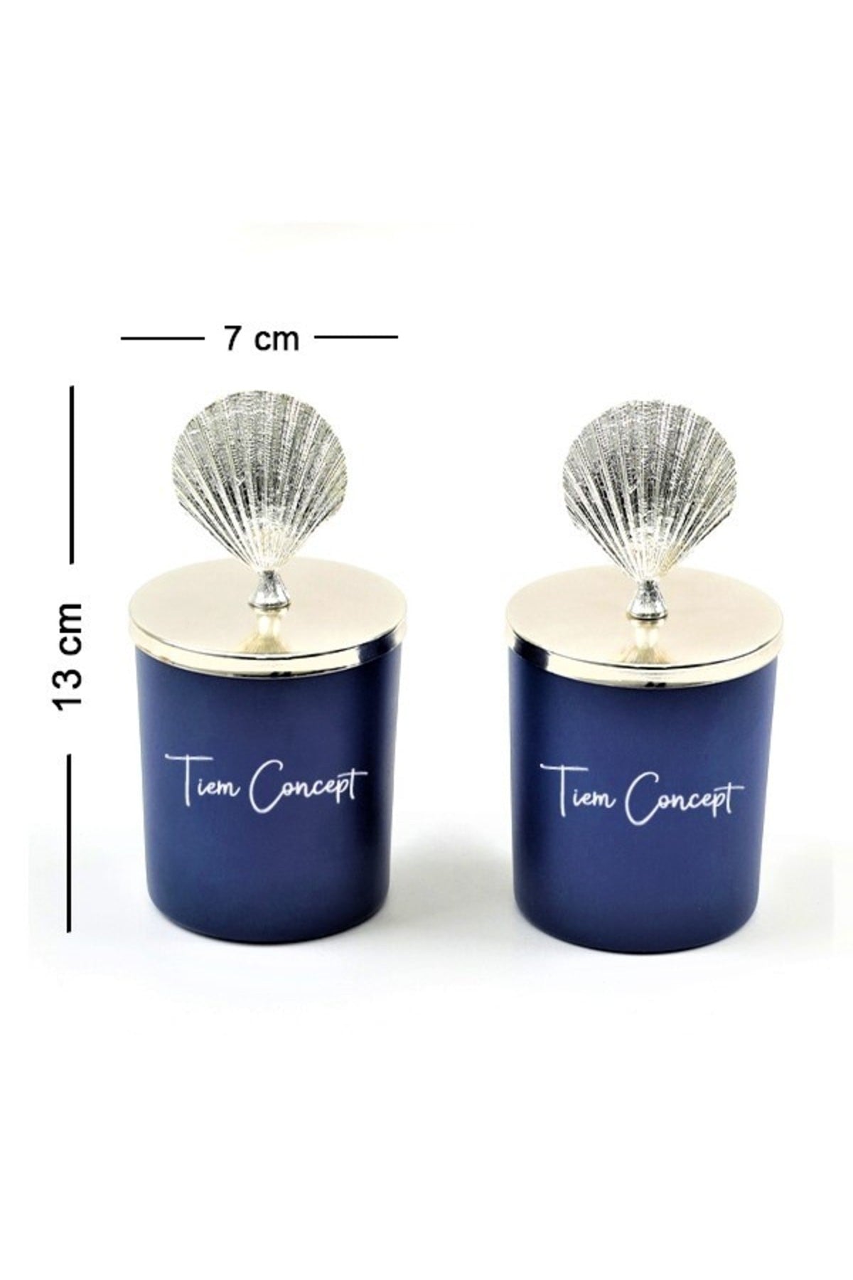 Dekoratif Gümüş Deniz Kabuğu Tepelikli Okyanus Kokulu 2li Lacivert Bardak Mum Seti