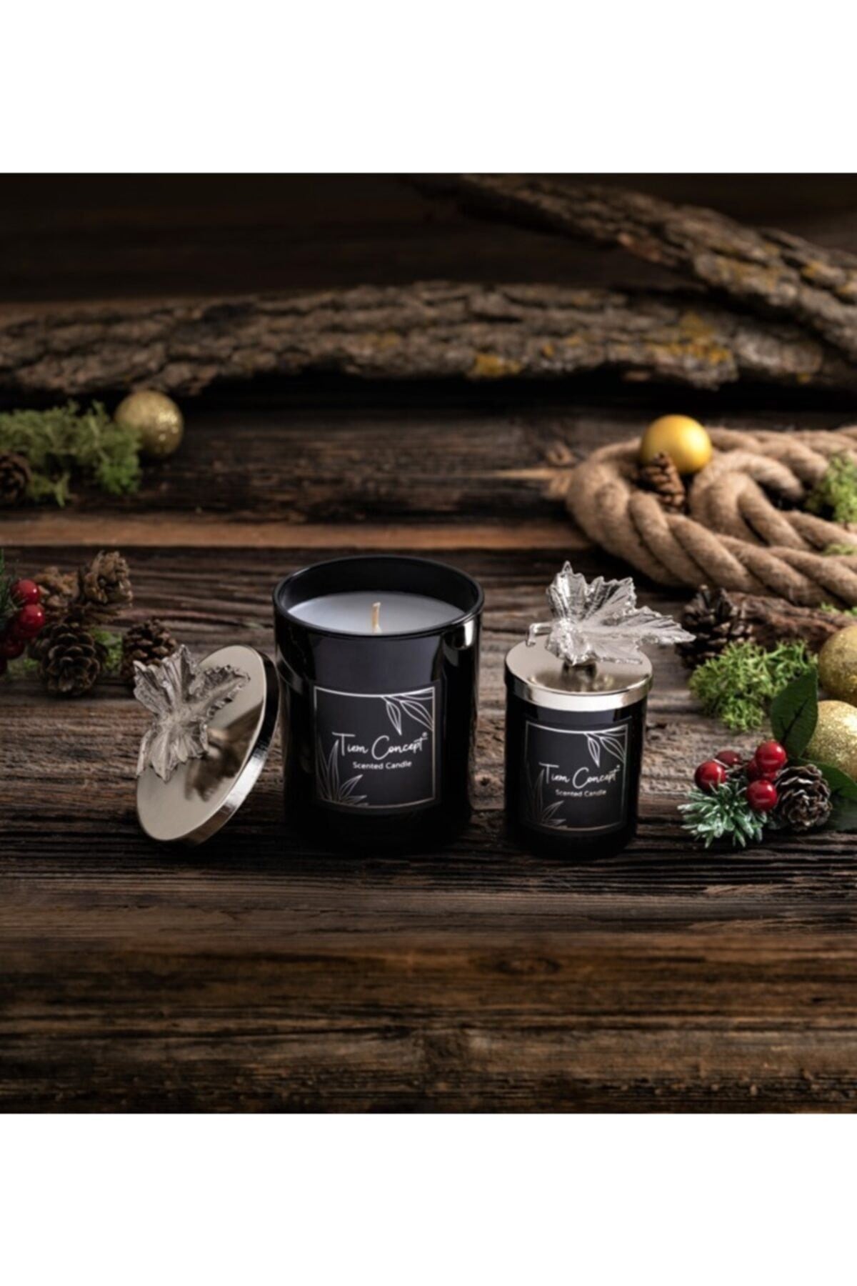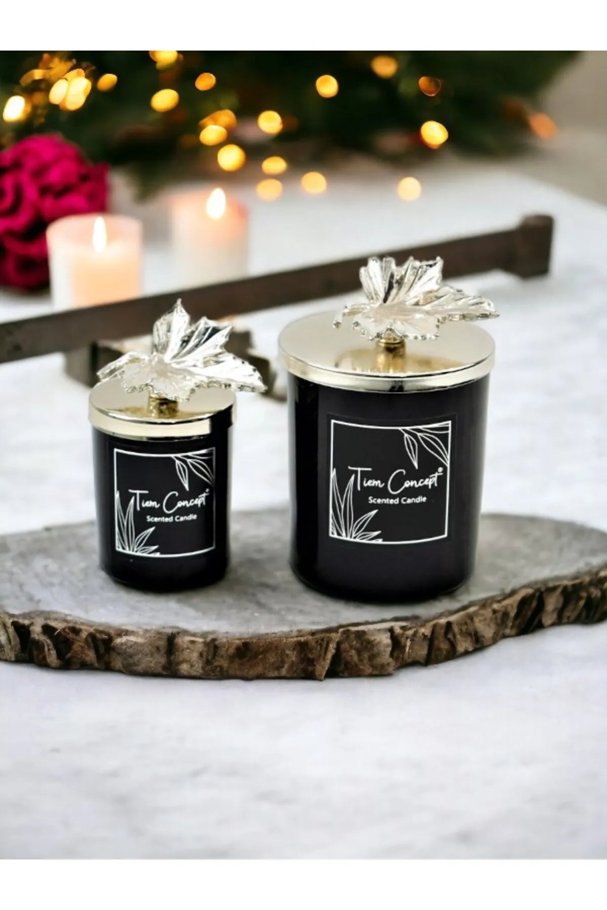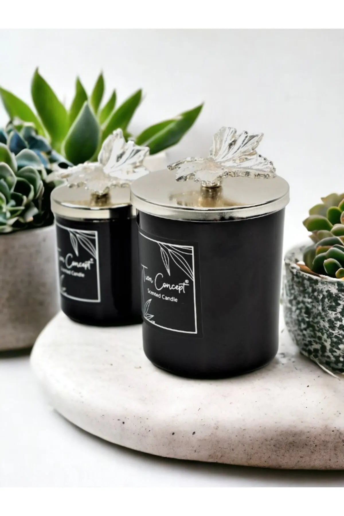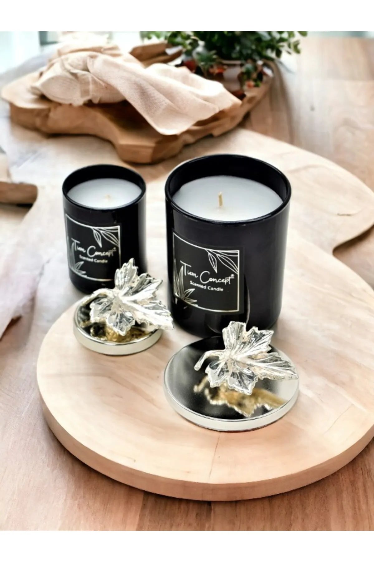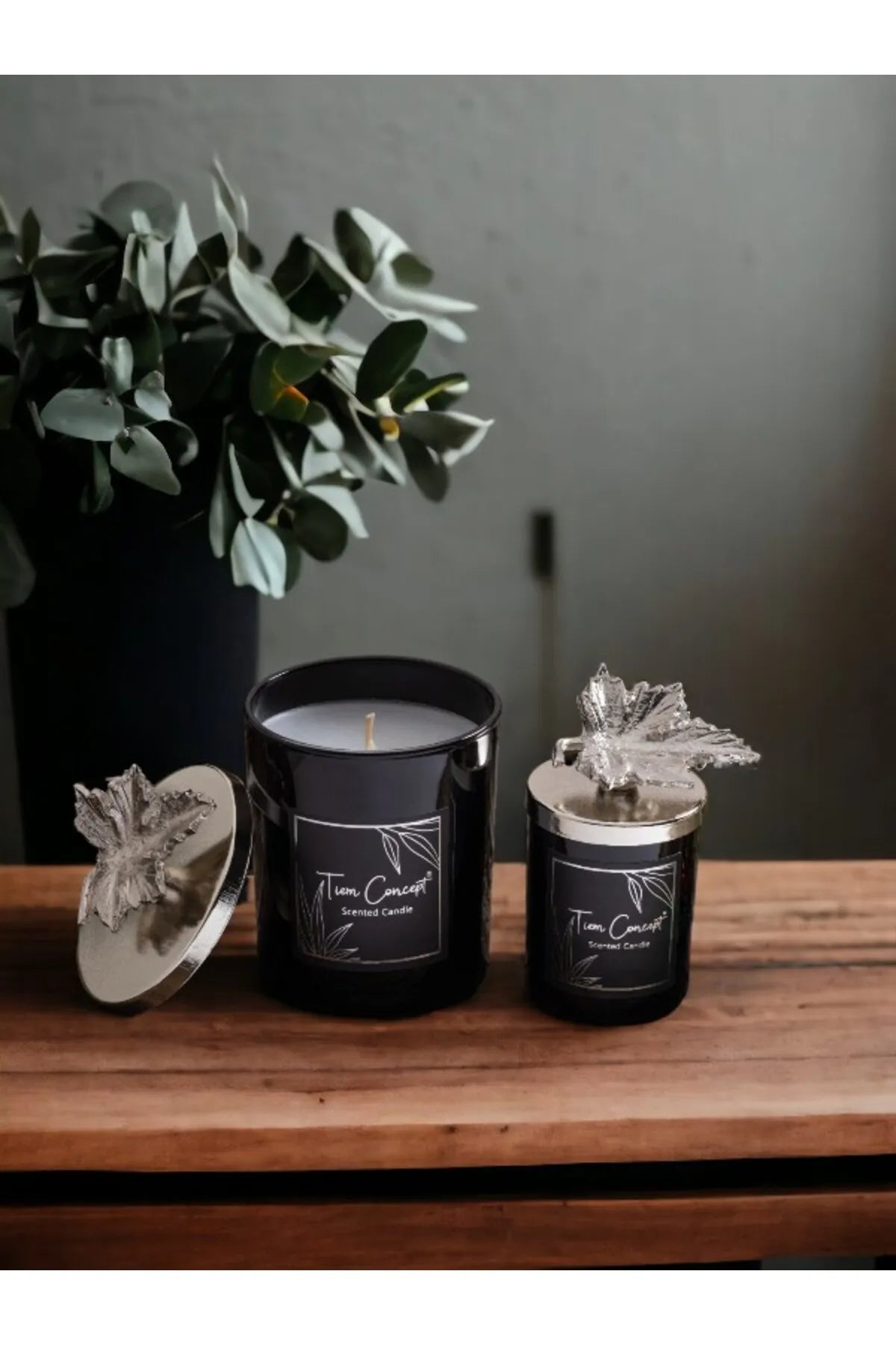 Dekoratif Gümüş Yaprak Tepelikli 2'li Siyah Bardak Mum Seti