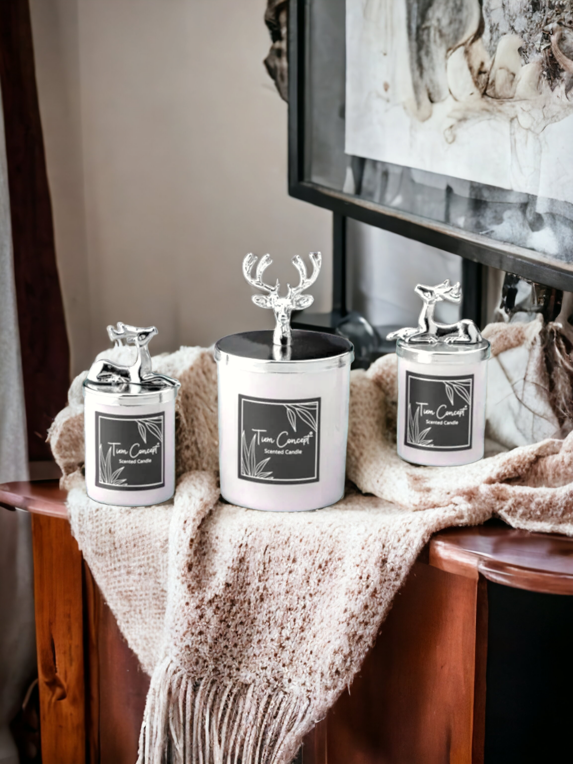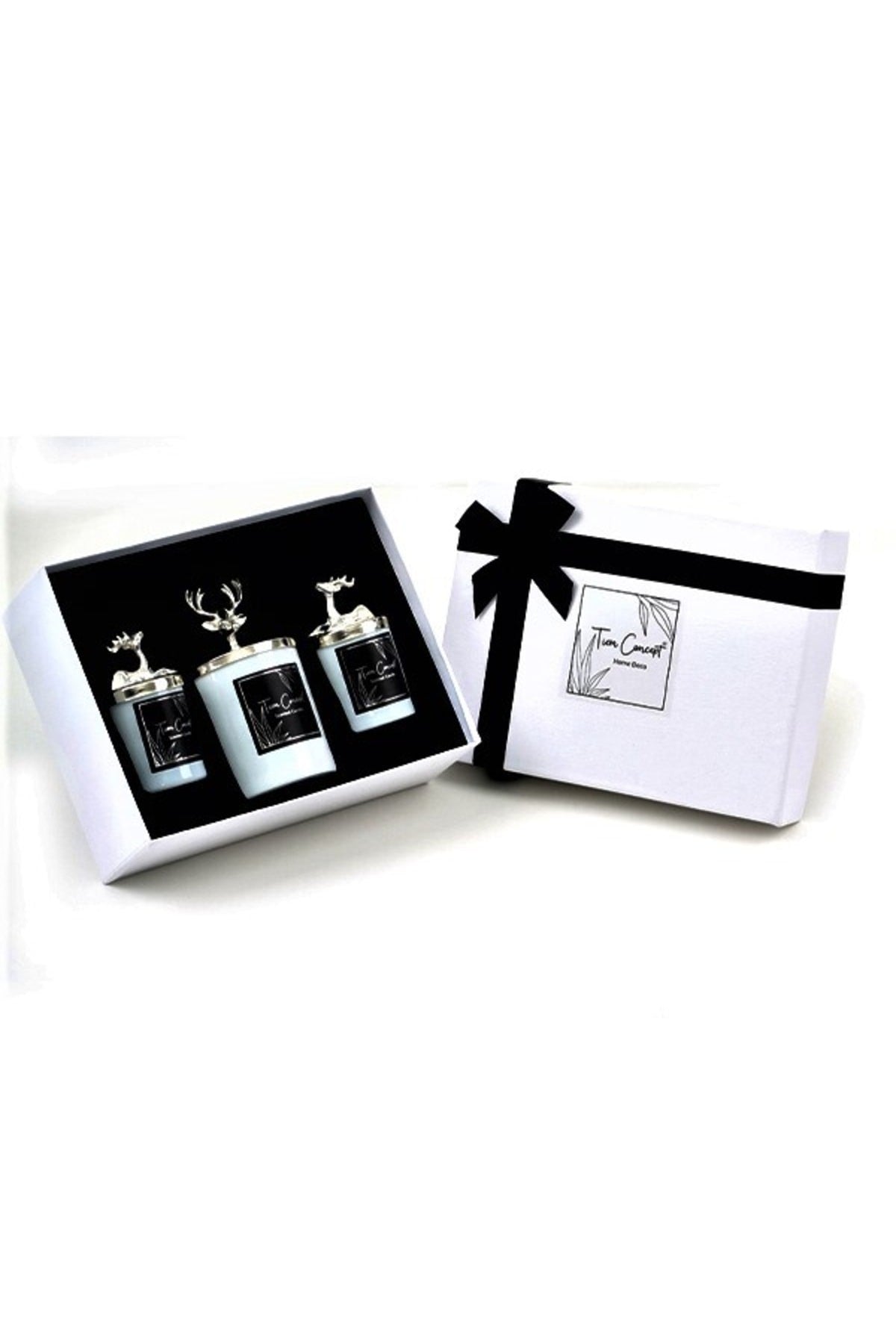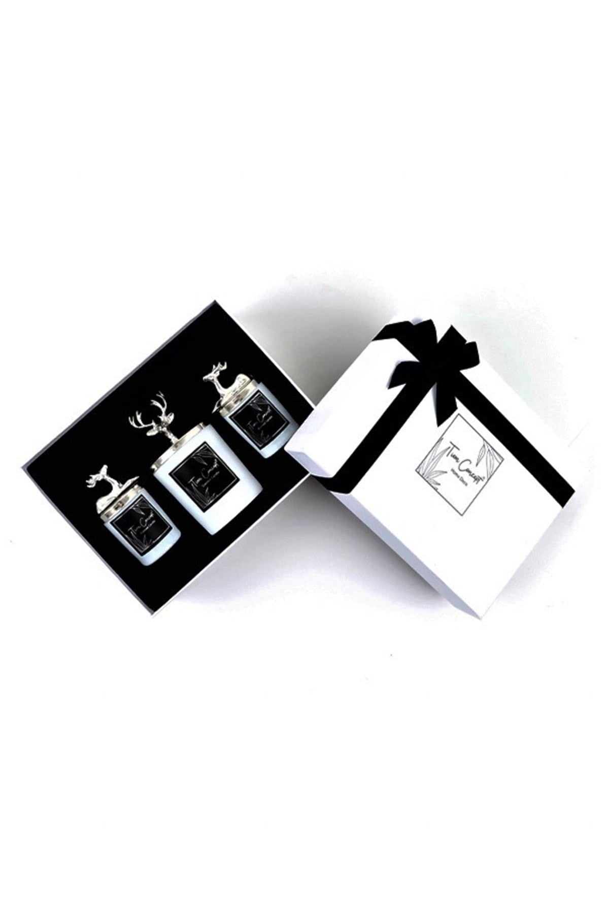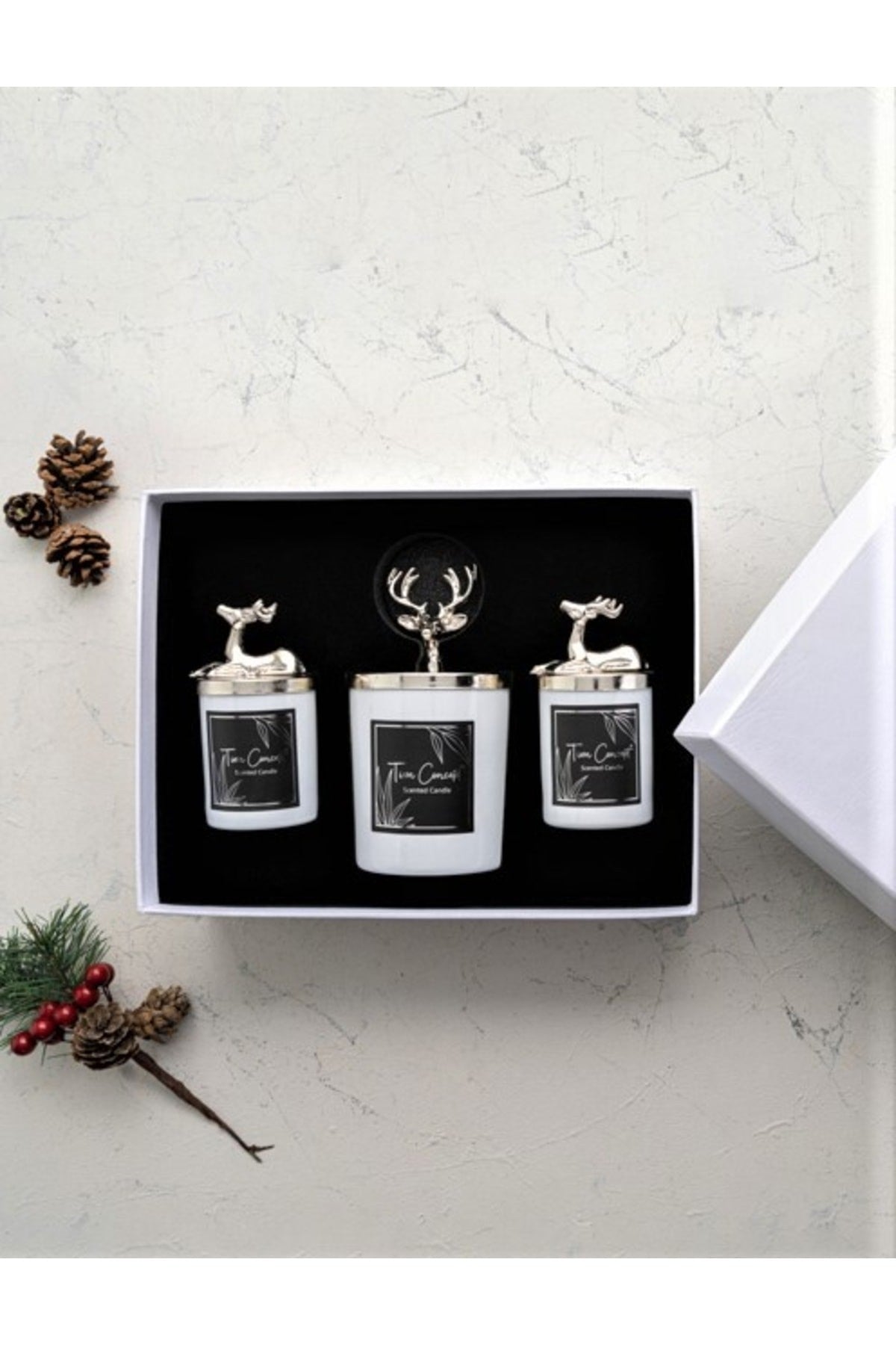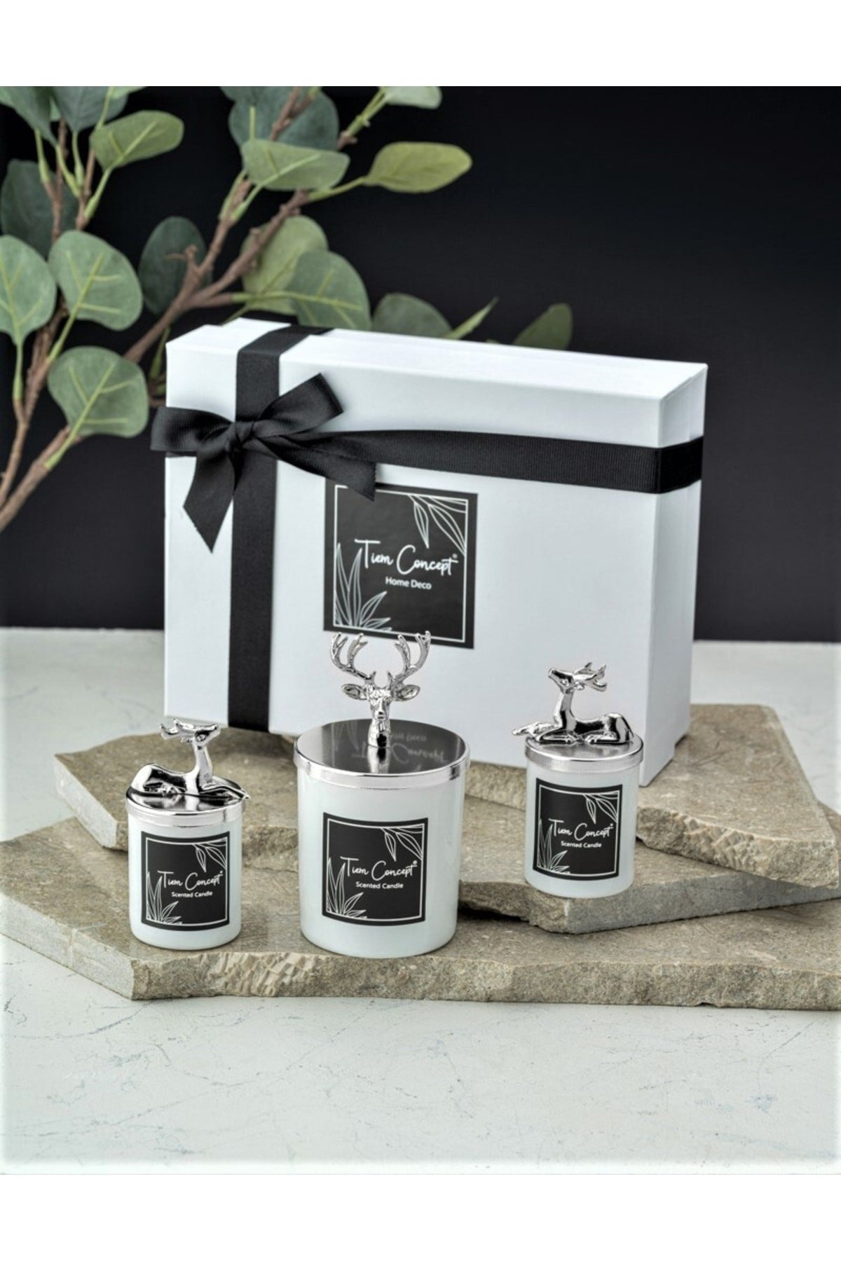 Dekoratif Hediye Kutulu Vanilya Kokulu Gümüş Geyikli 3 'lü Beyaz Bardak Mum Seti