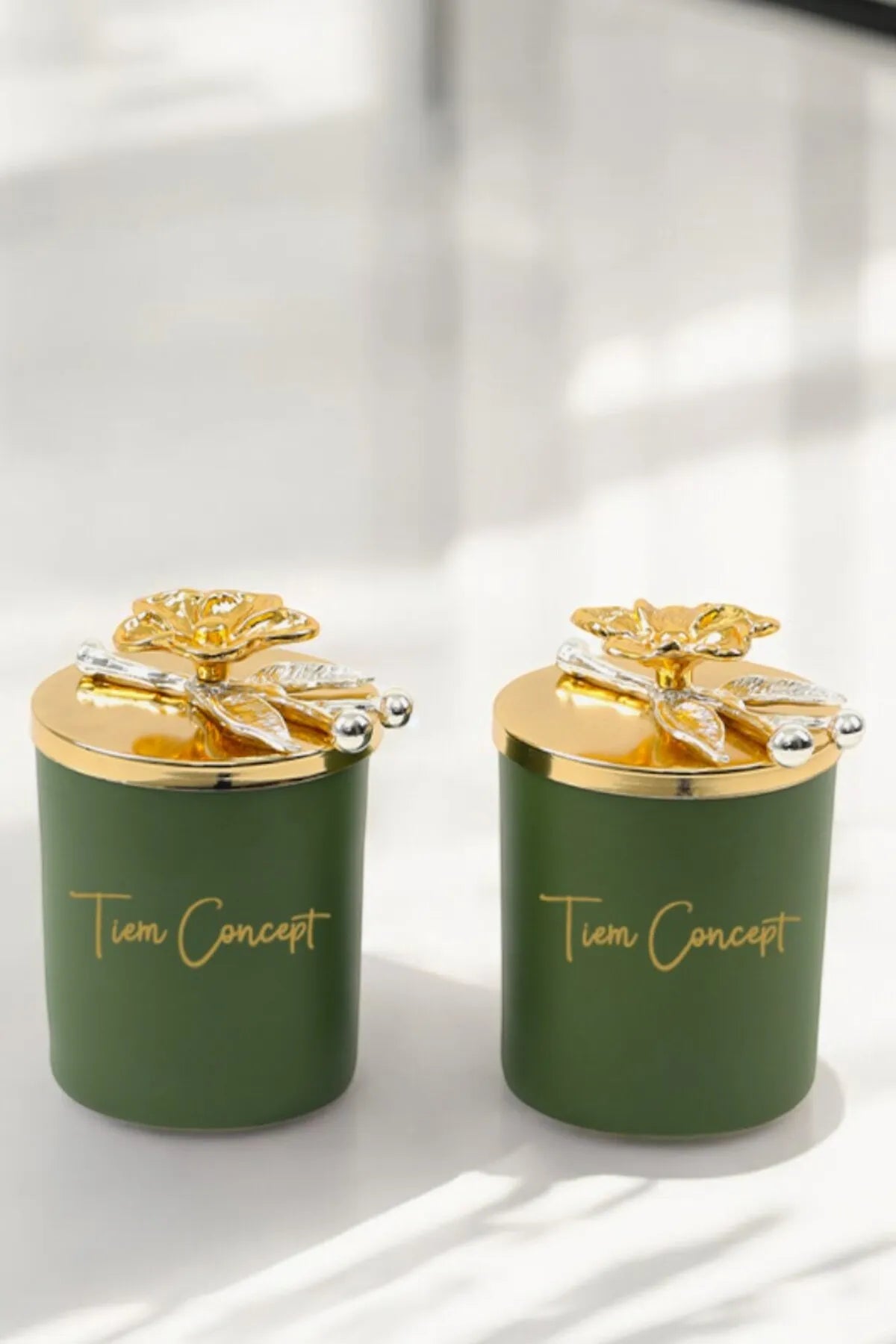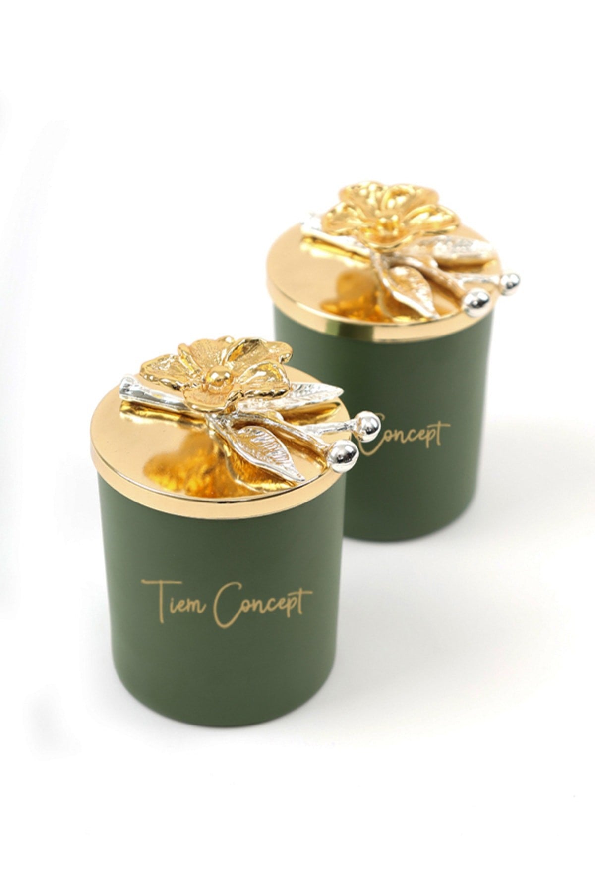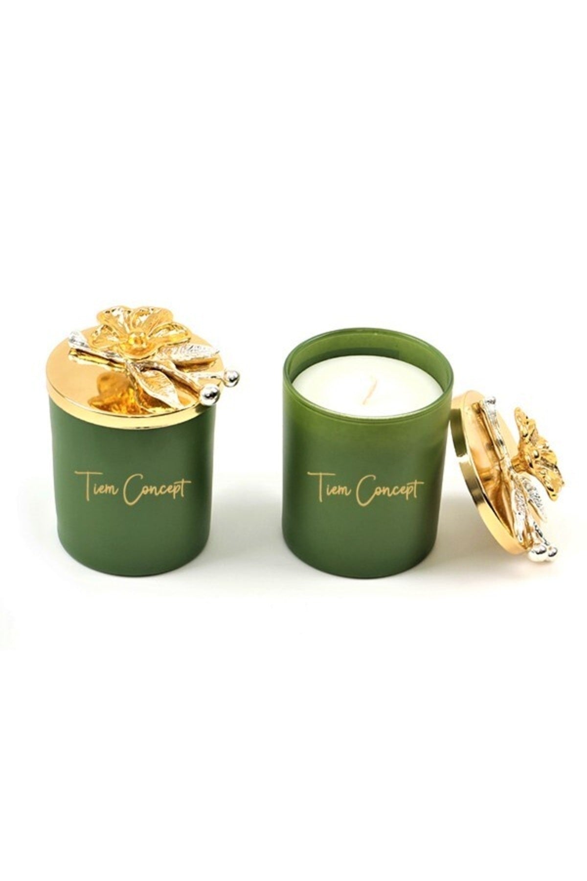 Dekoratif Özel Tasarım Gold Çiçek Tepelikli Yeşil Çay Kokulu 2li Yeşil Bardak Mum Seti