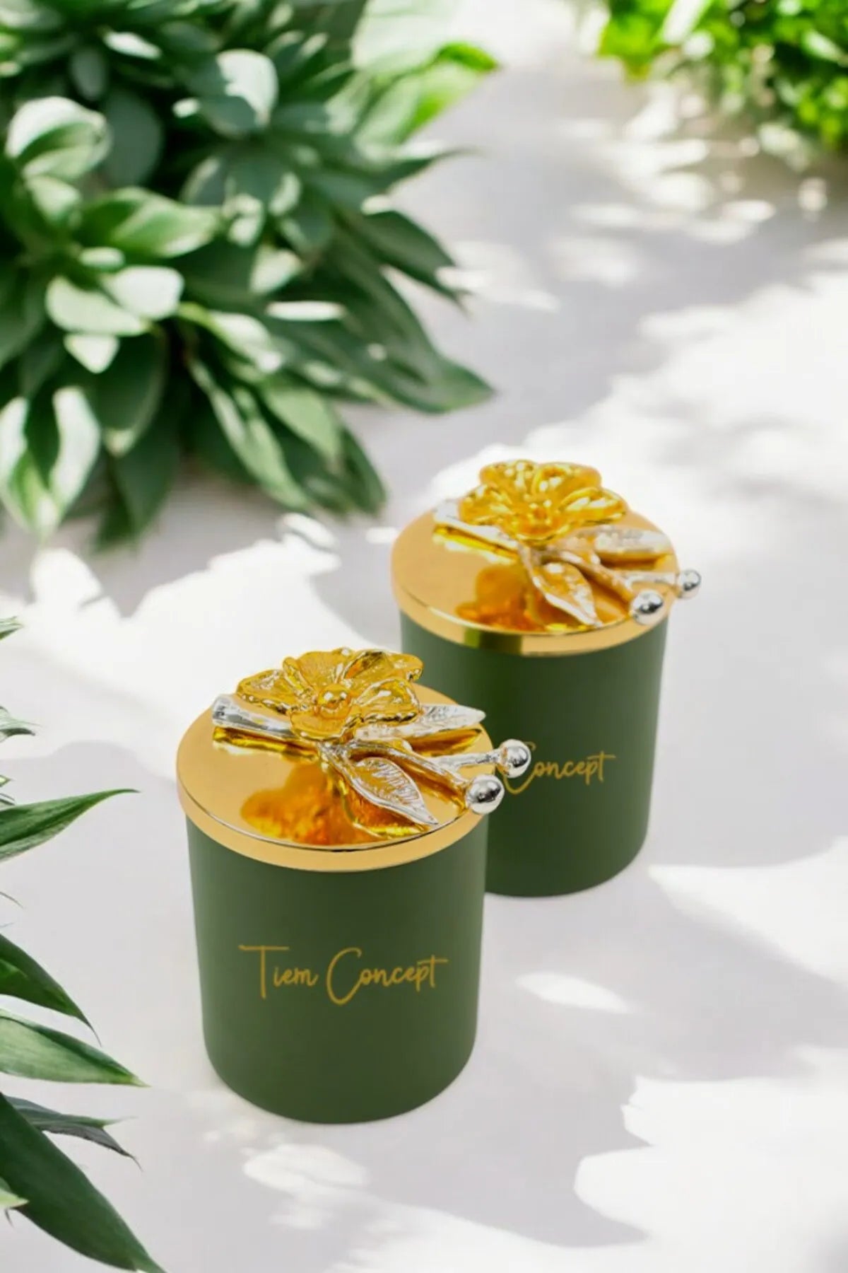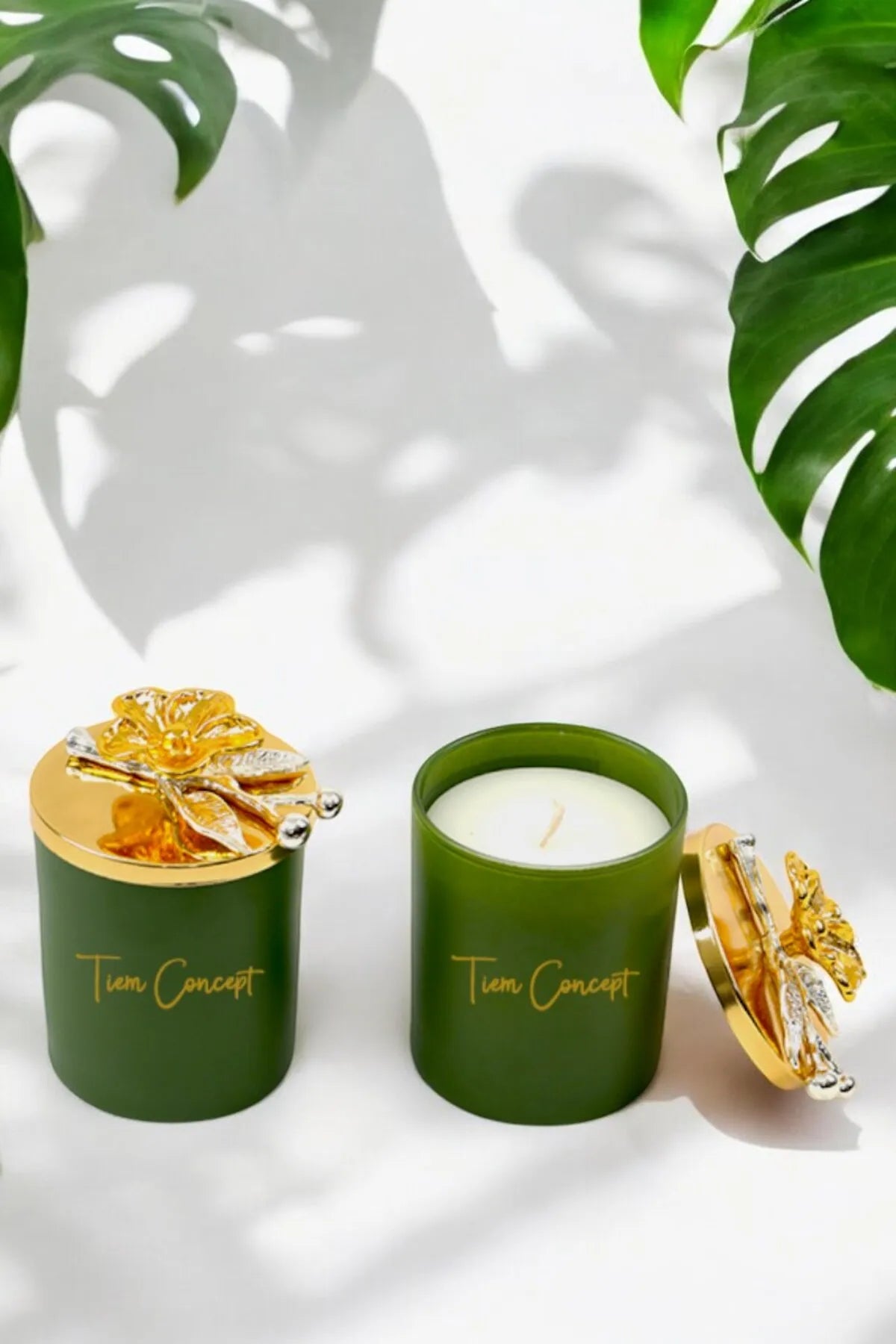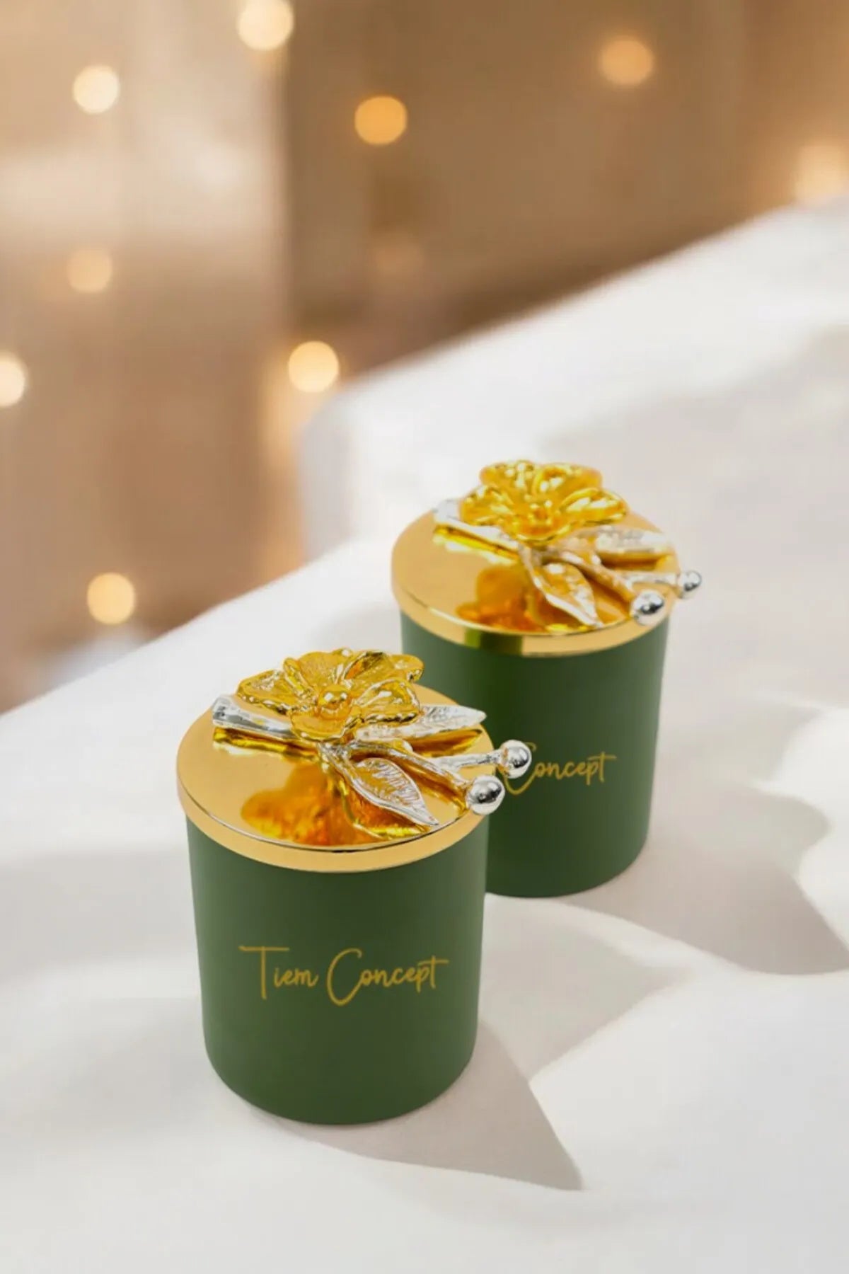 Dekoratif Özel Tasarım Gold Çiçek Tepelikli Yeşil Çay Kokulu 2li Yeşil Bardak Mum Seti