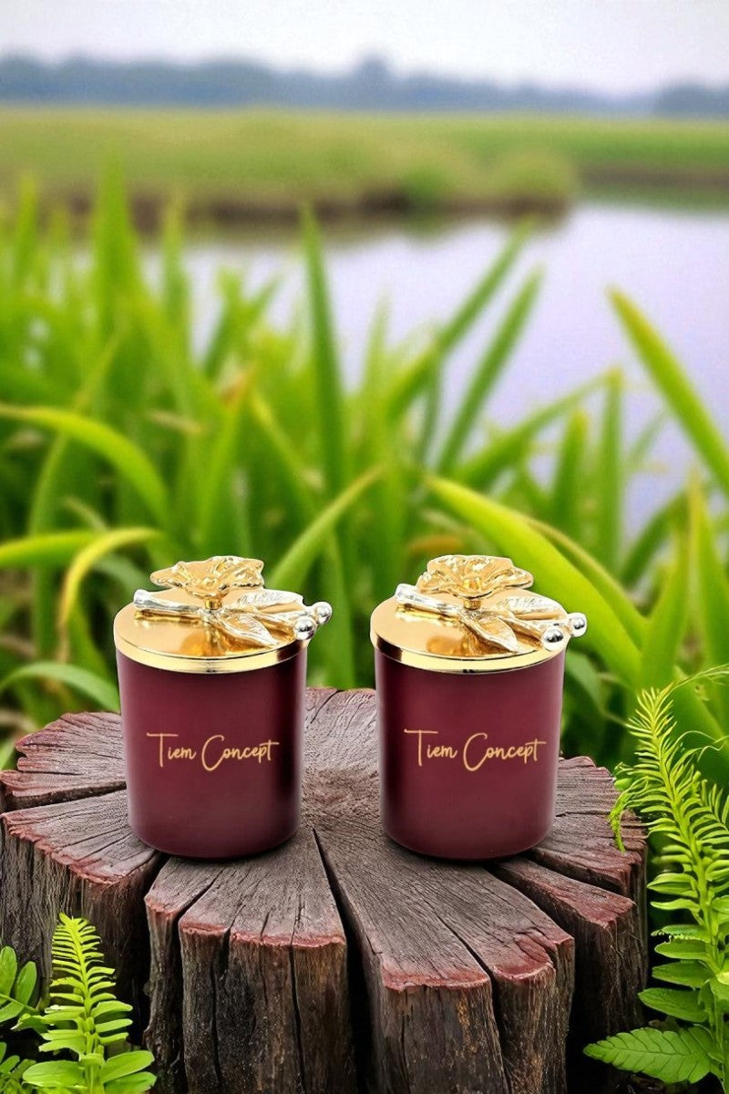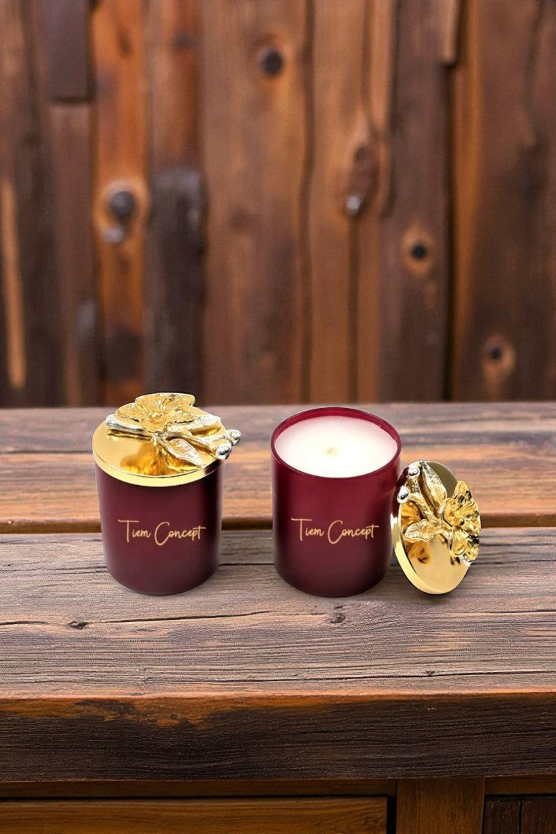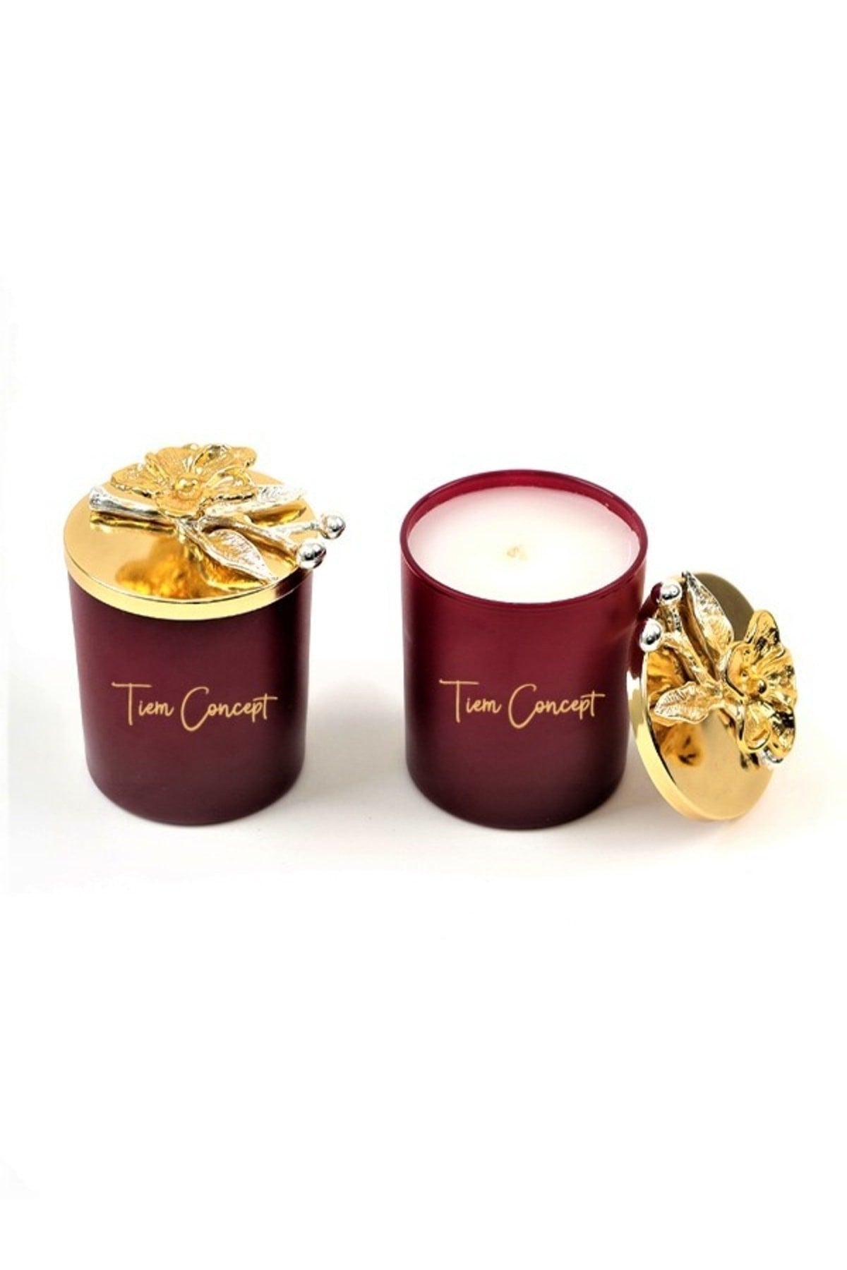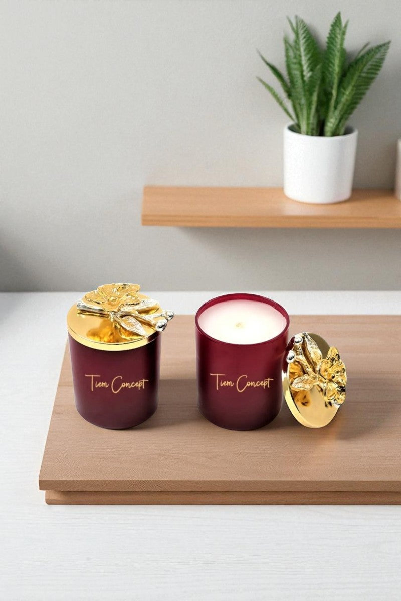Dekoratif Özel Tasarım Gold Dallı Çiçek Tepelikli Amber Kokulu 2li Bordo Bardak Mum Seti