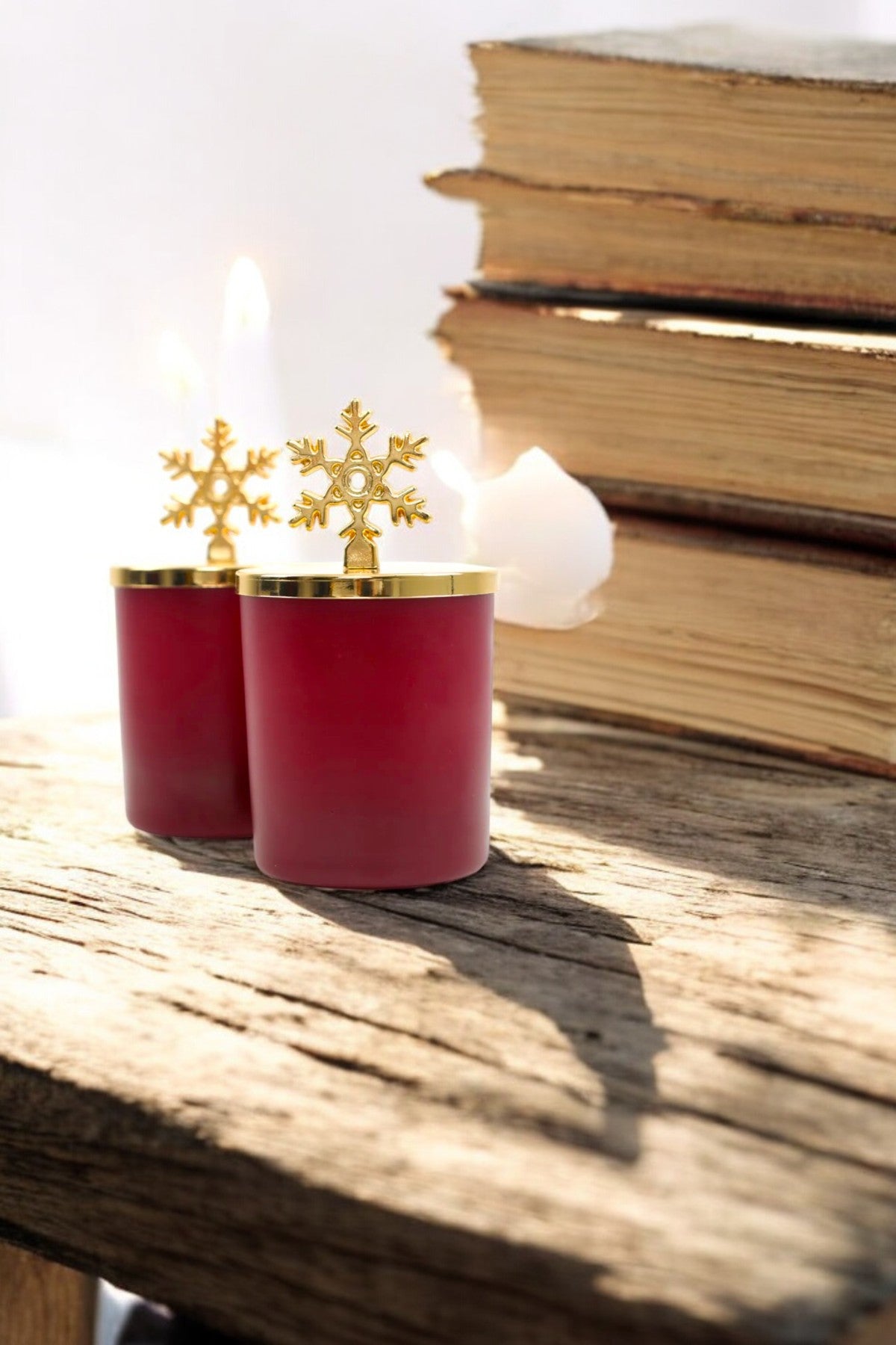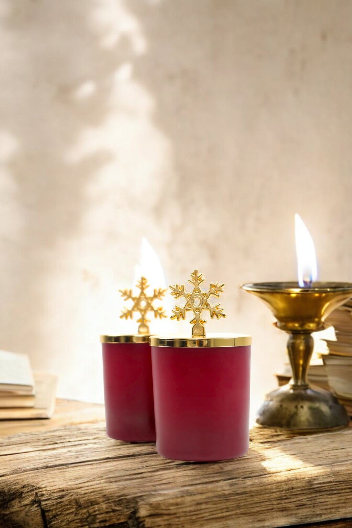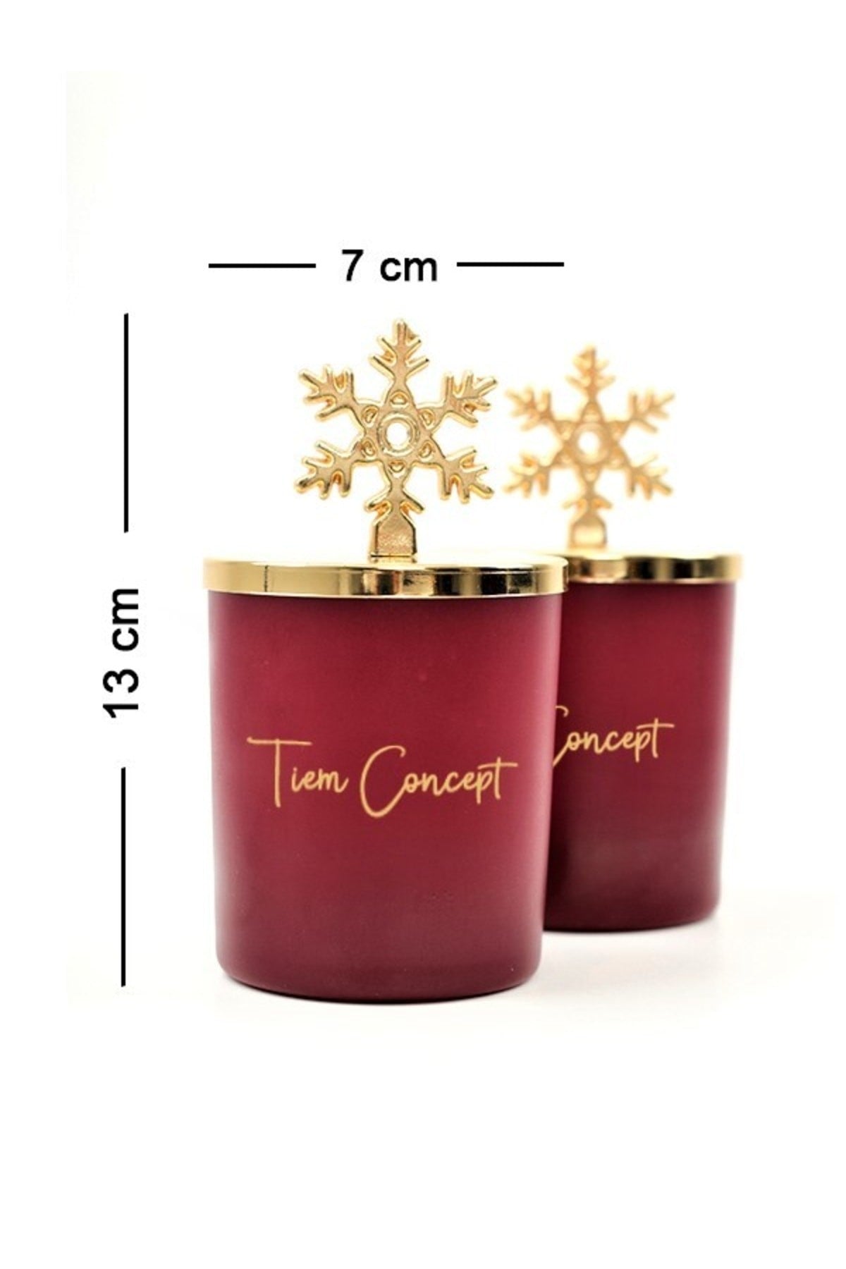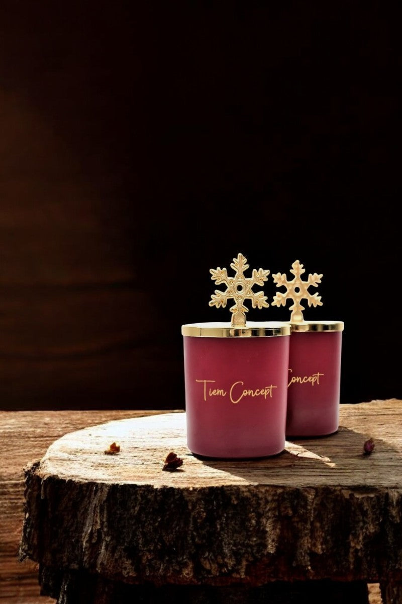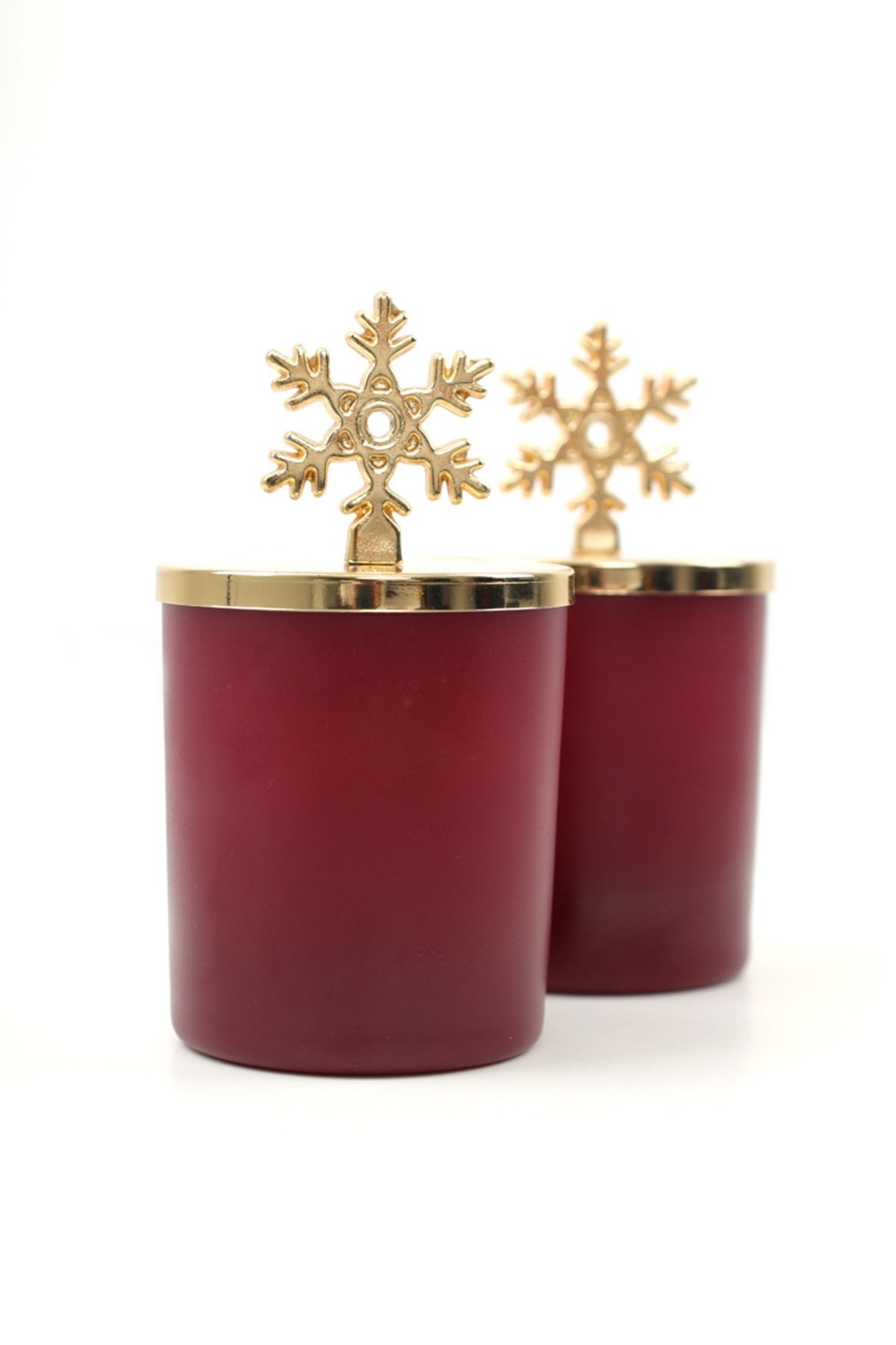 Tiem Concept Dekoratif Özel Tasarım Gold Kar Tanesi Tepelikli Amber Kokulu 2li Bordo Bardak Mum Seti