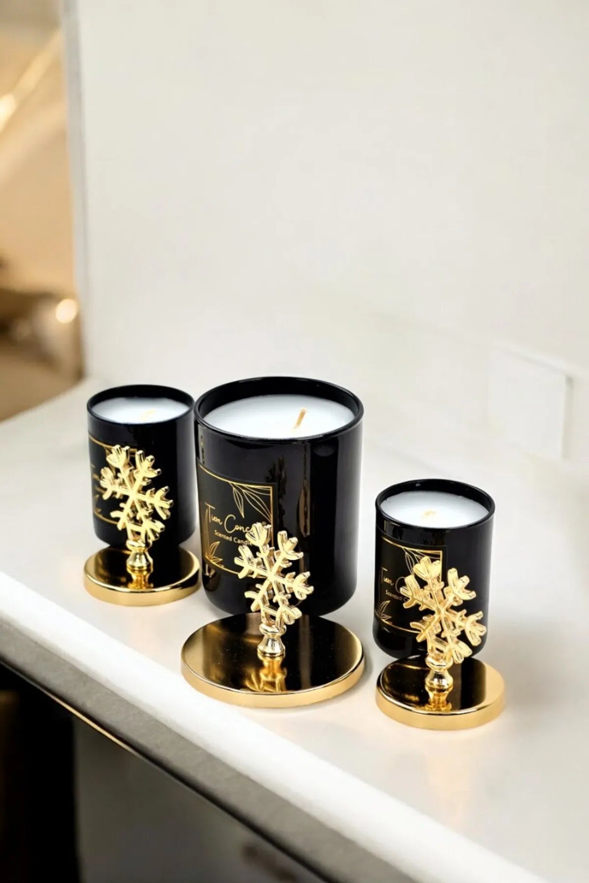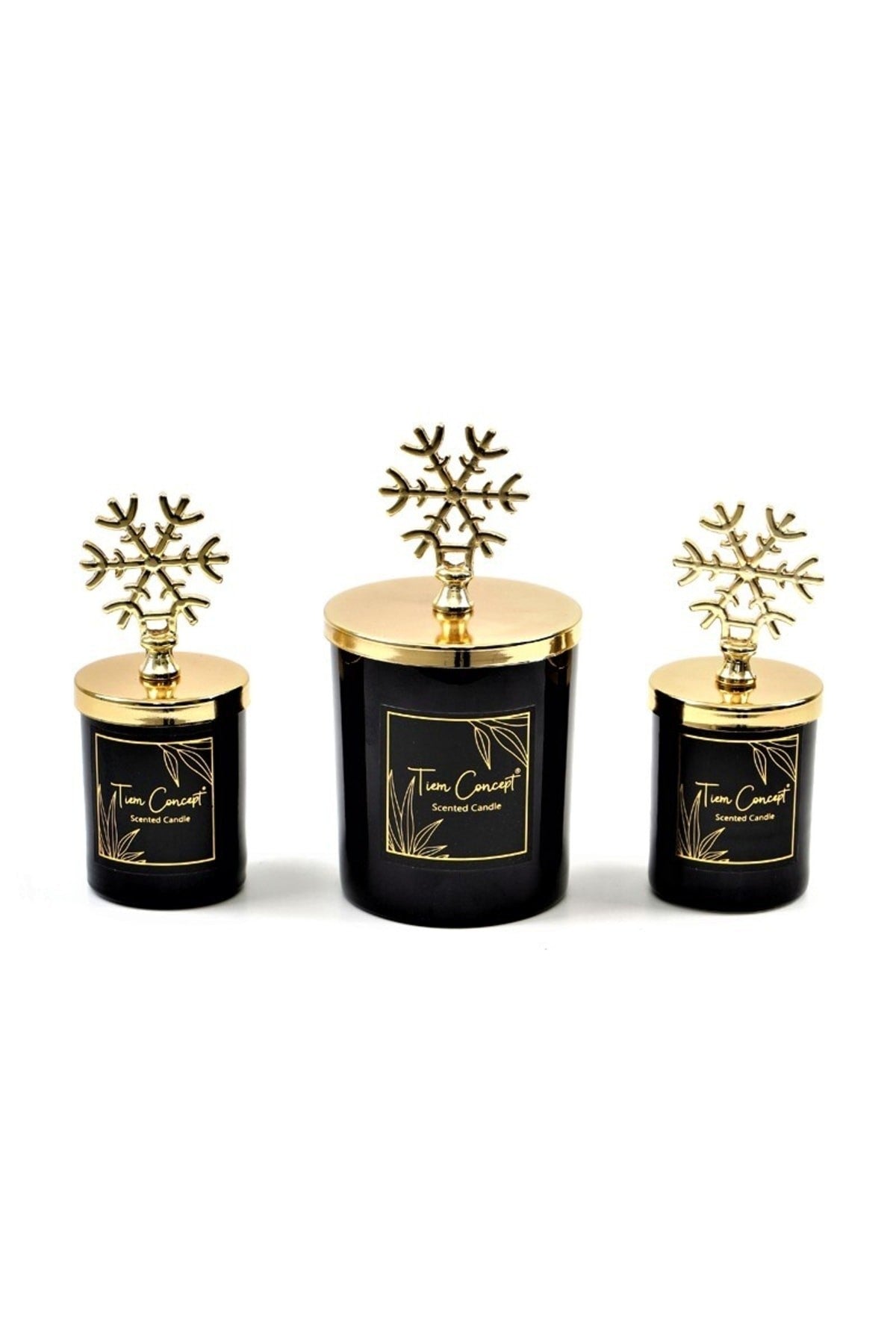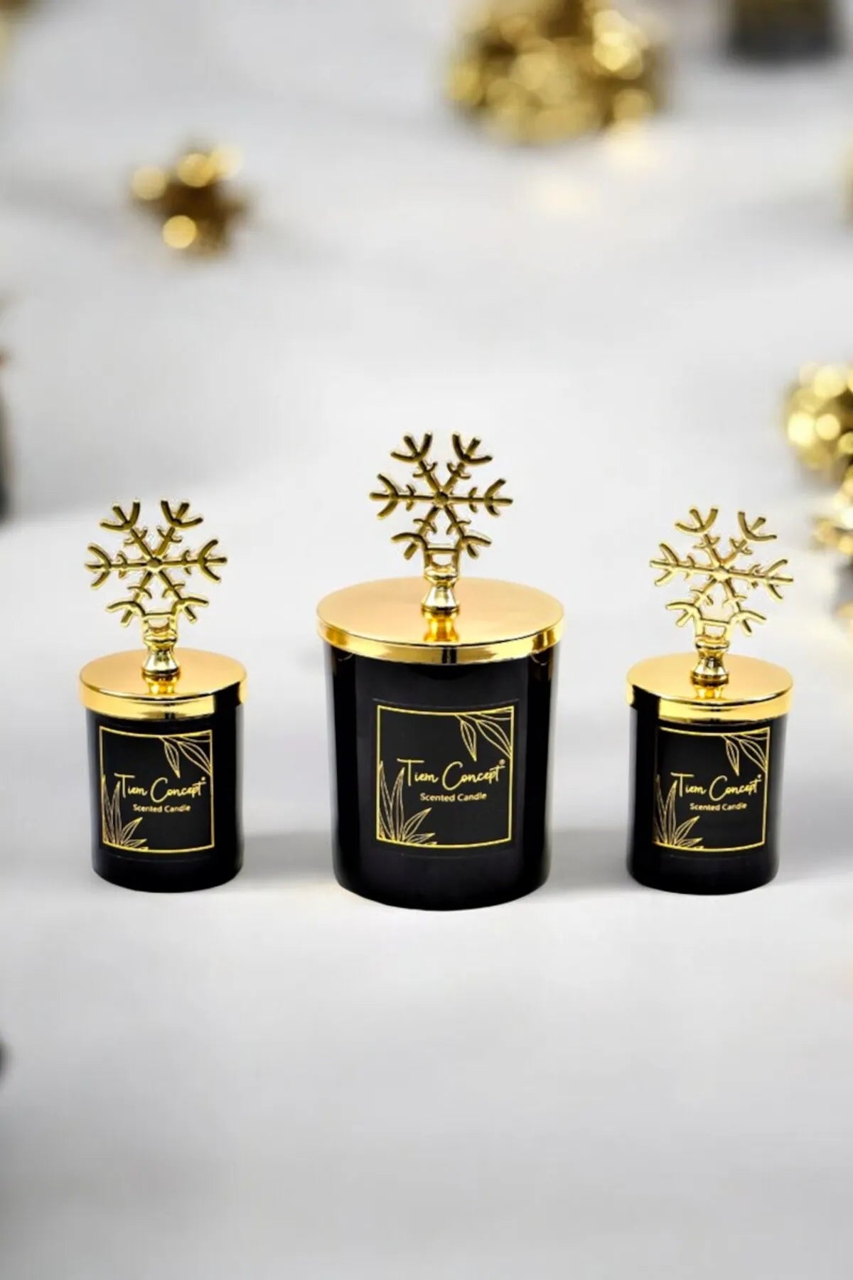 Dekoratif Özel Tasarım Gold Kar taneli Vanilya Kokulu 3'lü Siyah Bardak Mum Seti