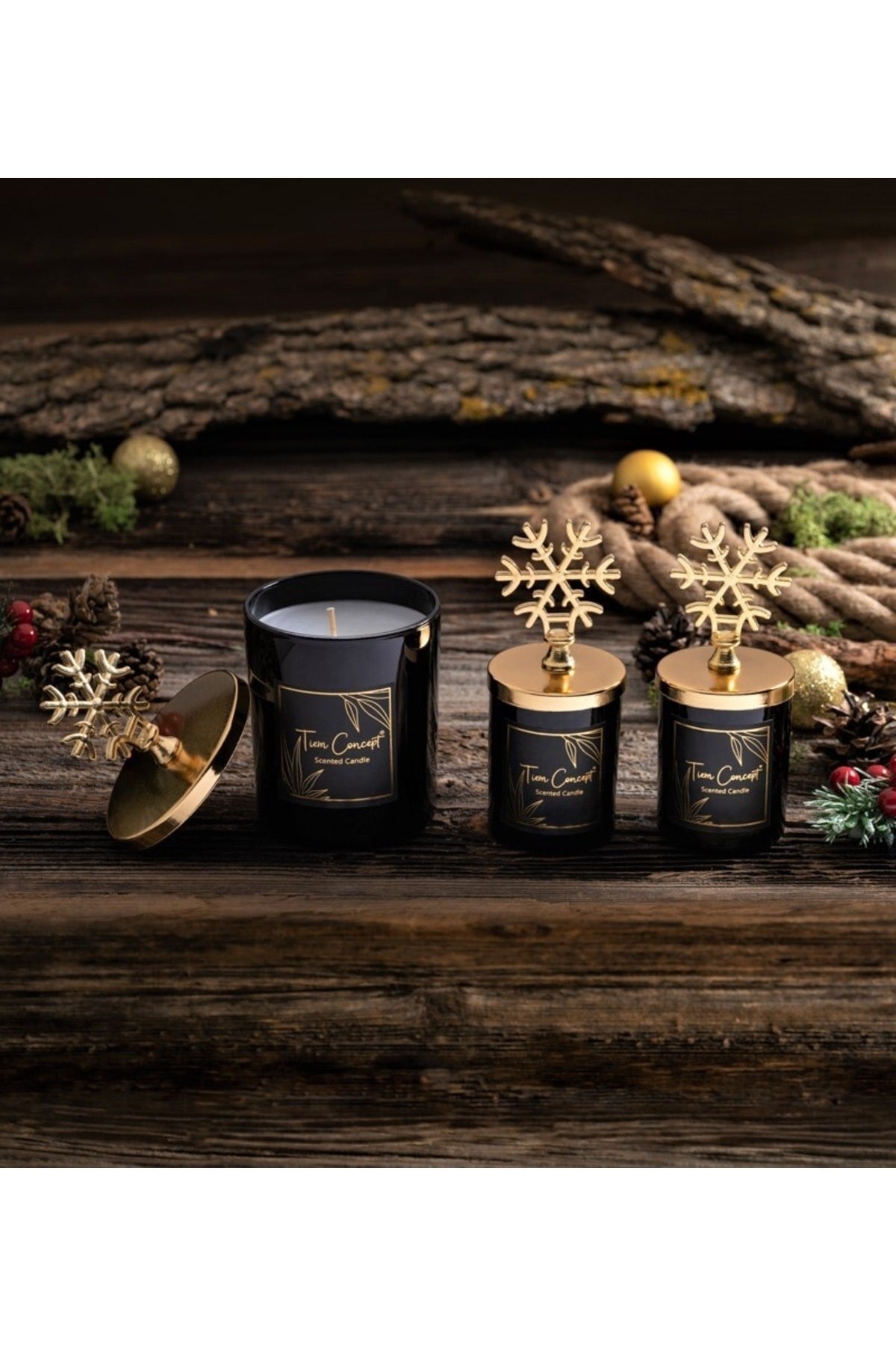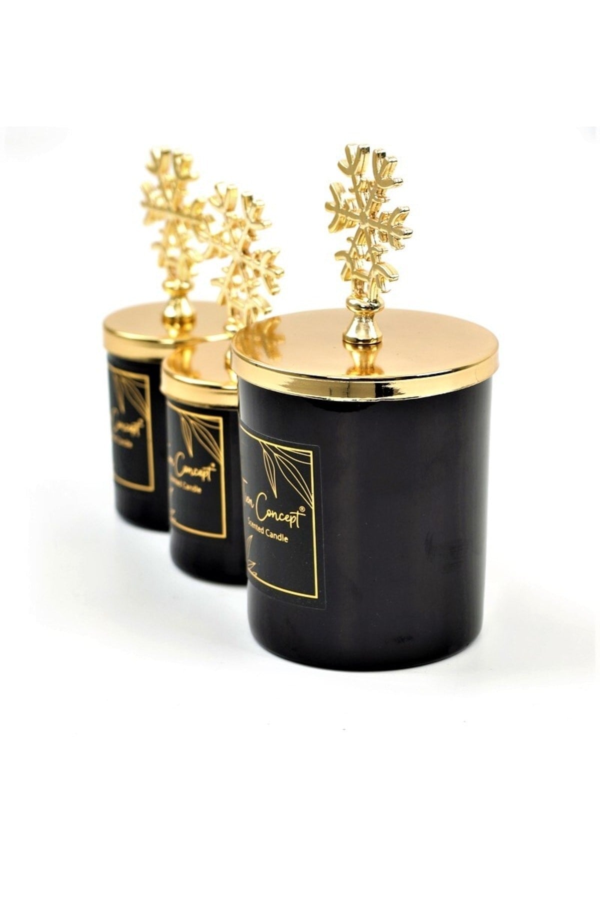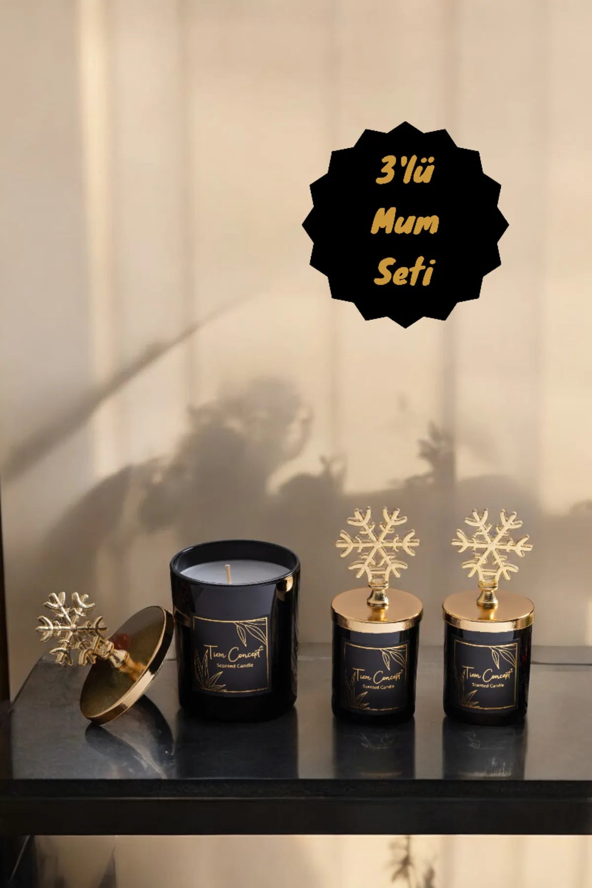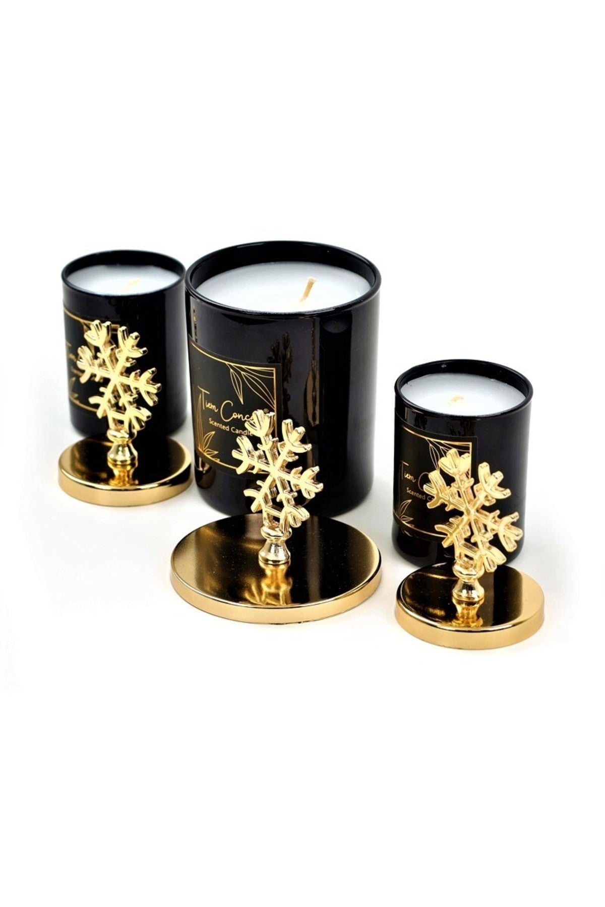 Dekoratif Özel Tasarım Gold Kar taneli Vanilya Kokulu 3'lü Siyah Bardak Mum Seti