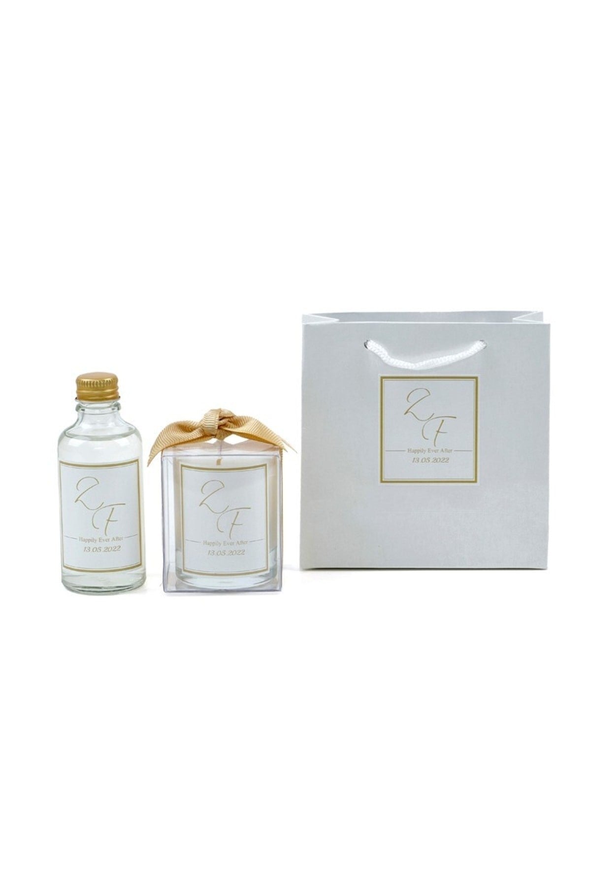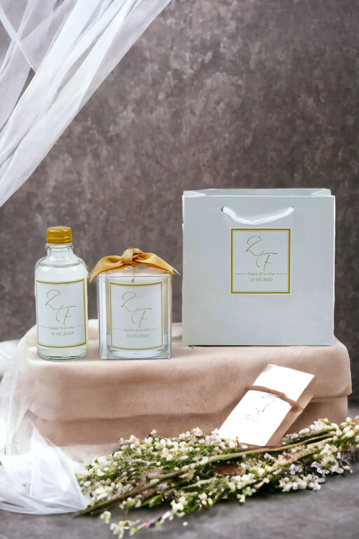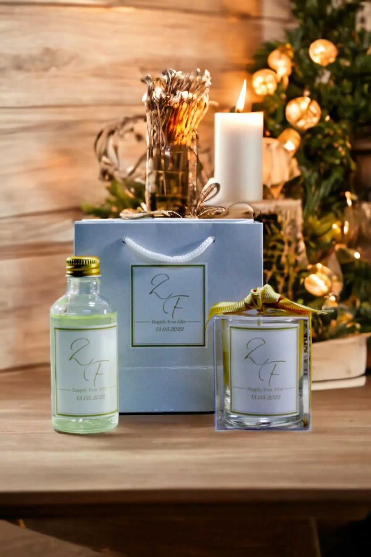 Kişiye Özel Düğün& Nikah şekeri Çantalı Kolonya ve Bardak Mum Seti 10'lu