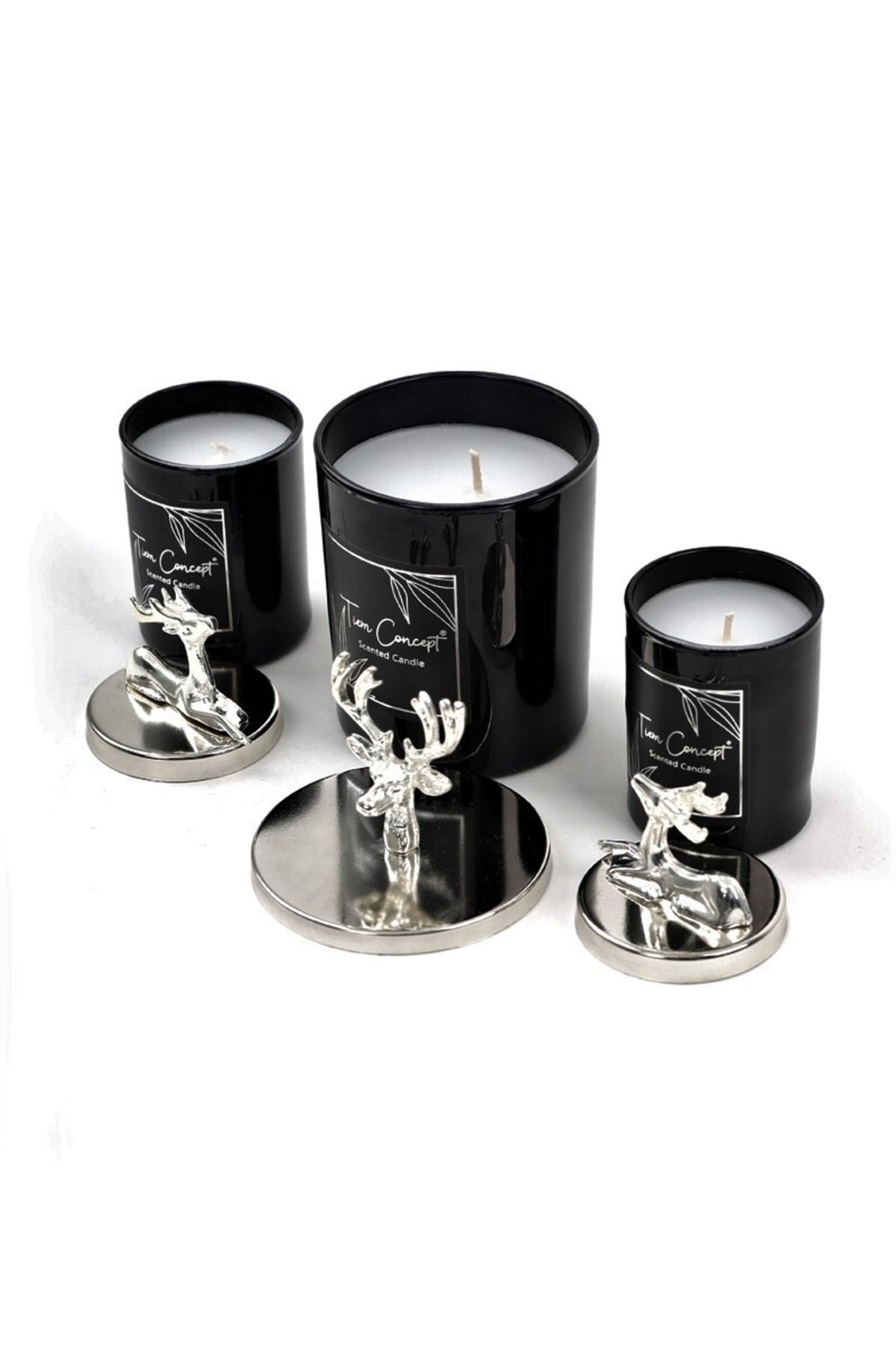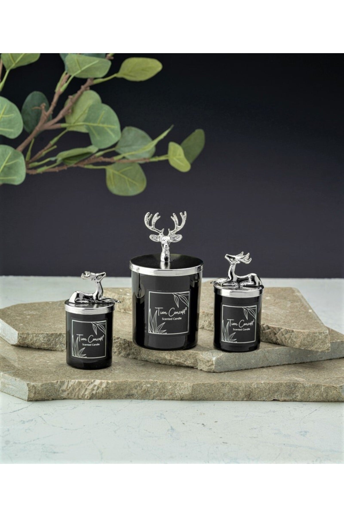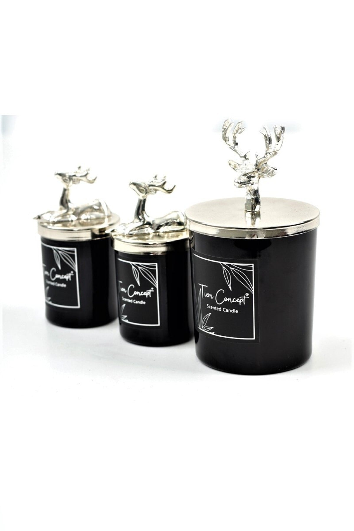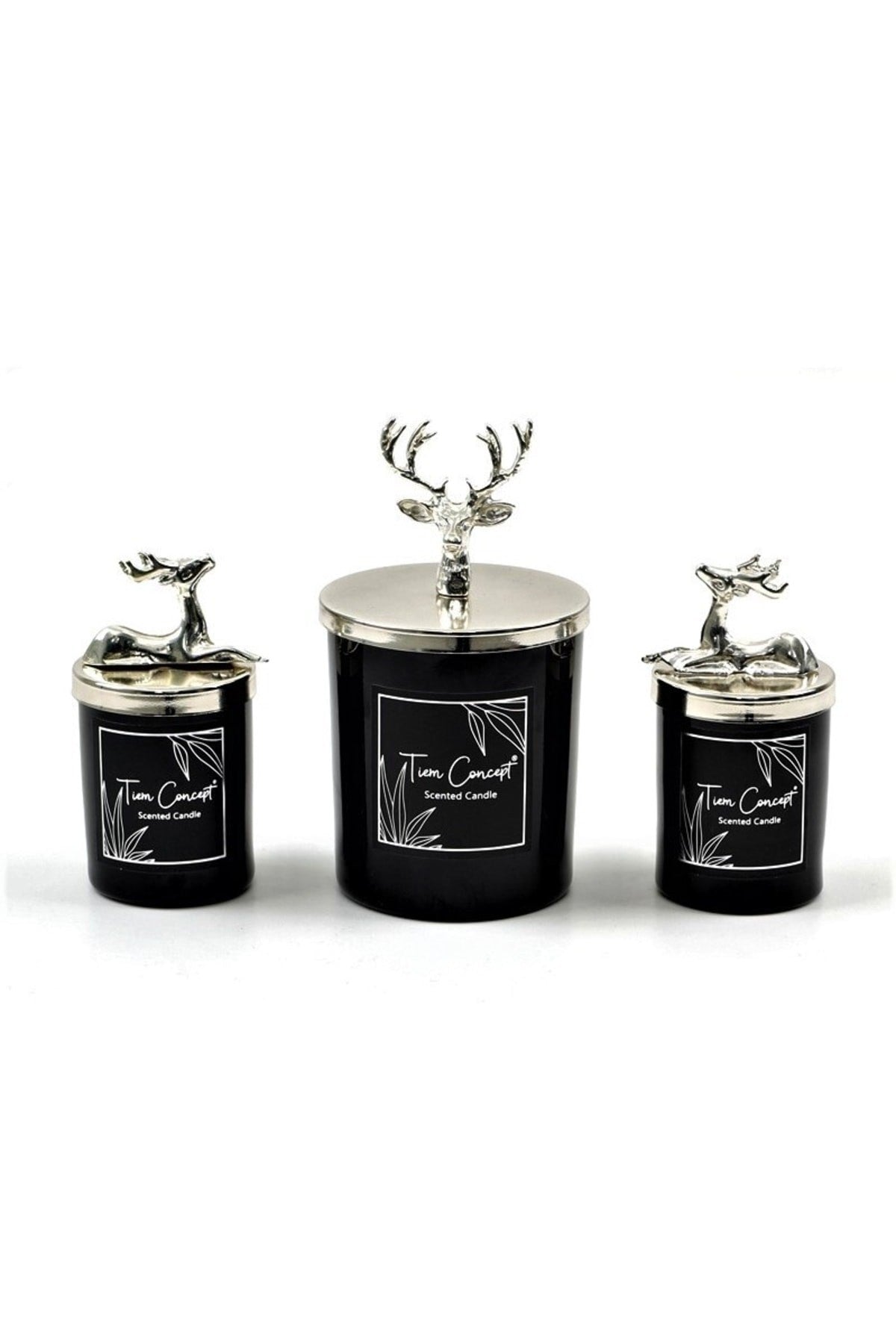 Dekoratif Gümüş Geyikli Vanilya Kokulu 3'lü Siyah Bardak Mum Seti