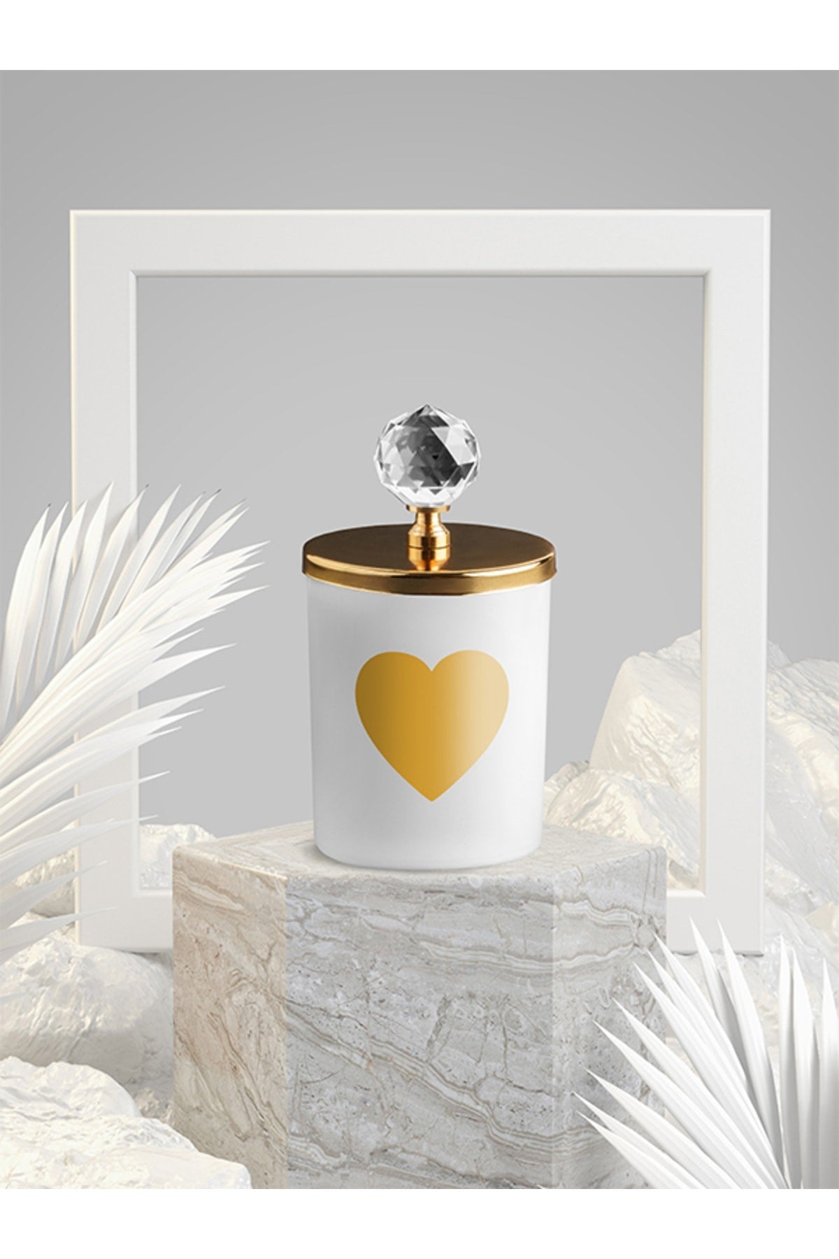 Özel Tasarım Kalpli Vanilya Kokulu Gold Kristal Tepelikli Beyaz Bardak Mum