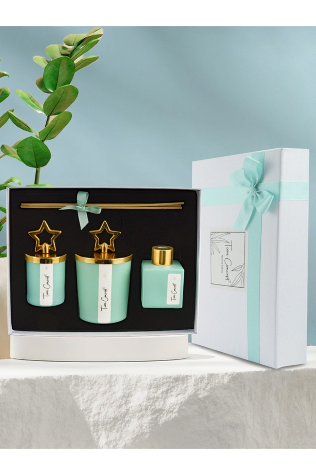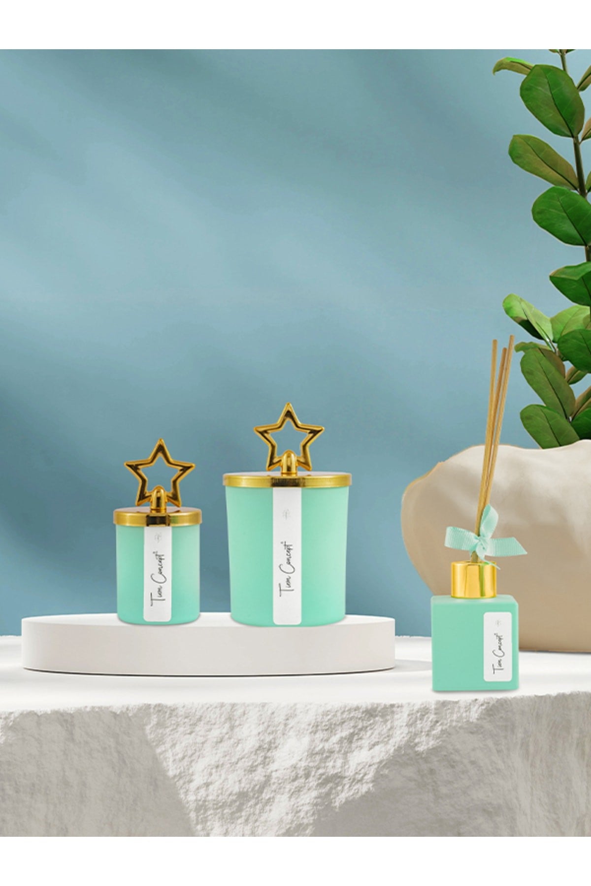 Özel Tasarım Kutulu Yeşil Çay Kokulu Gold Tepelikli 3lü Bardak Mum ve Oda Koku Seti