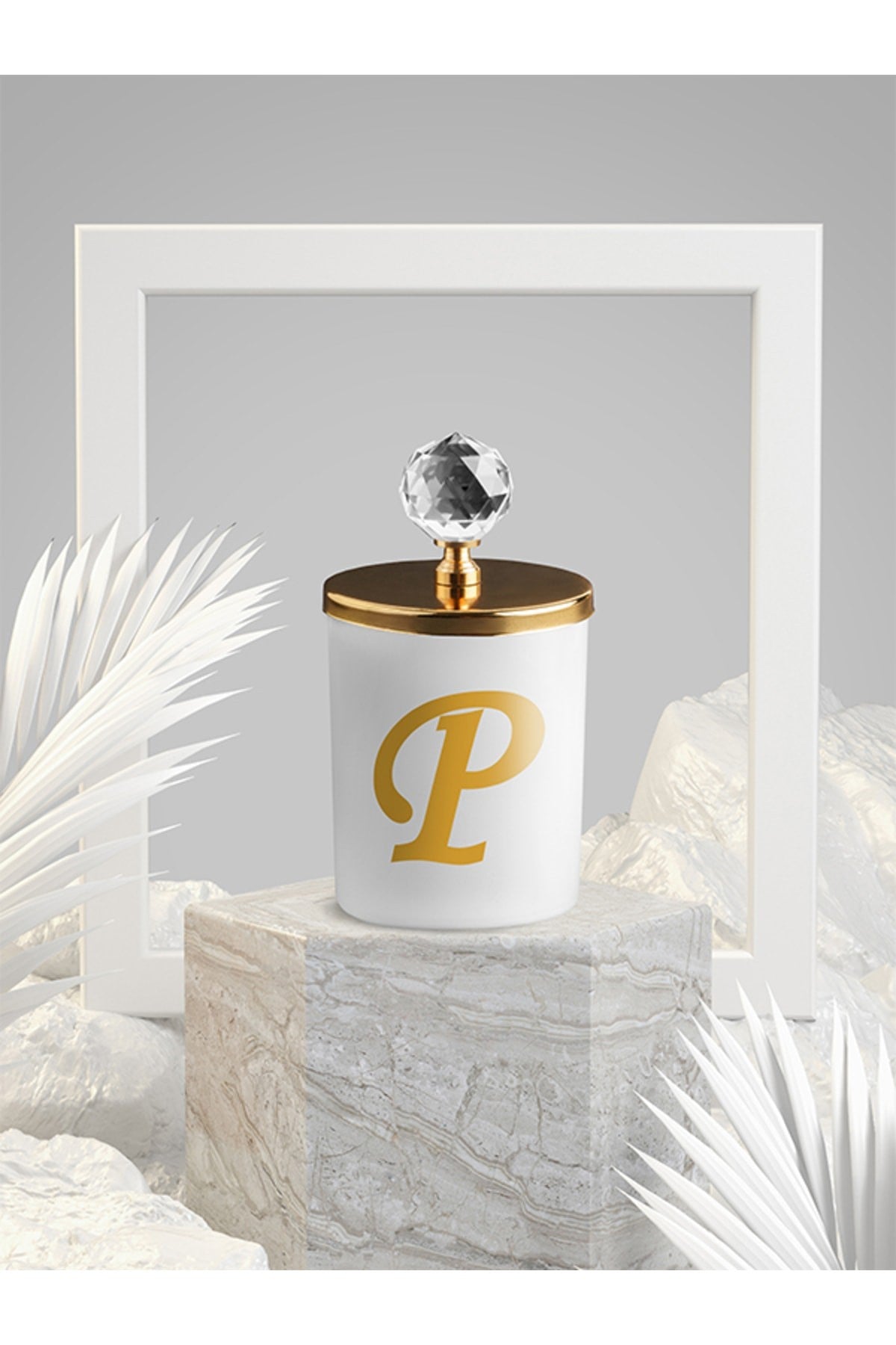 Özel Tasarım P Harfli Vanilya Kokulu Gold Kristal Tepelikli Beyaz Bardak Mum