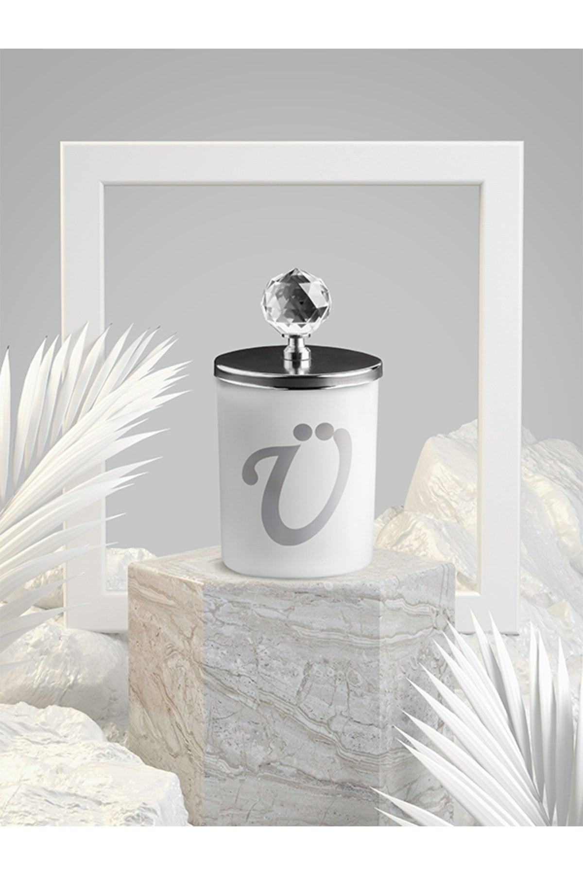 Özel Tasarım Ü Harfli Vanilya Kokulu Gümüş Kristal Tepelikli Beyaz Bardak Mum