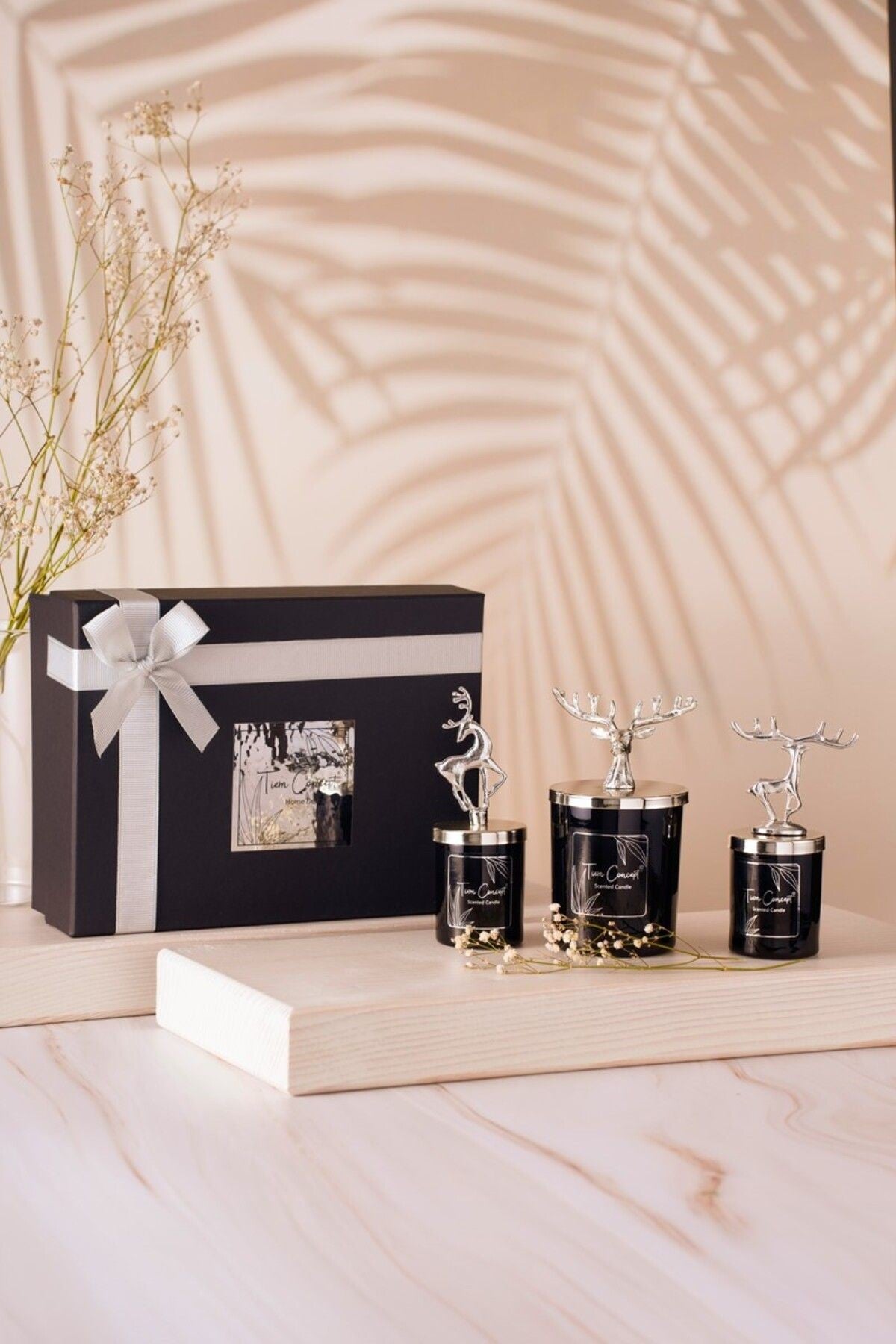 Yılbaşı Dekoratif Özel Tasarım Siyah Kutulu Vanilya Kokulu Gold Geyik Tepelikli 3lü Bardak Mum Seti