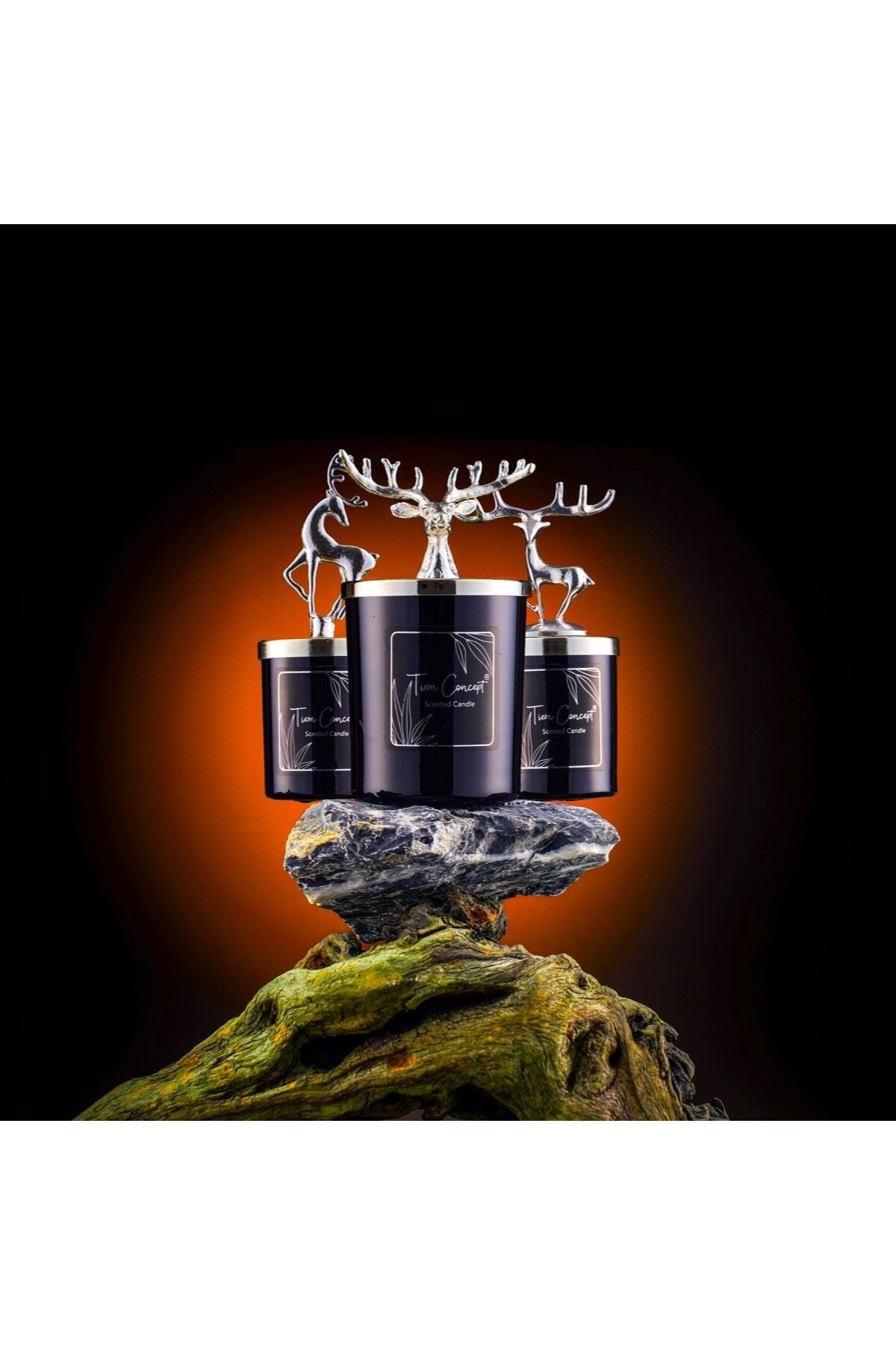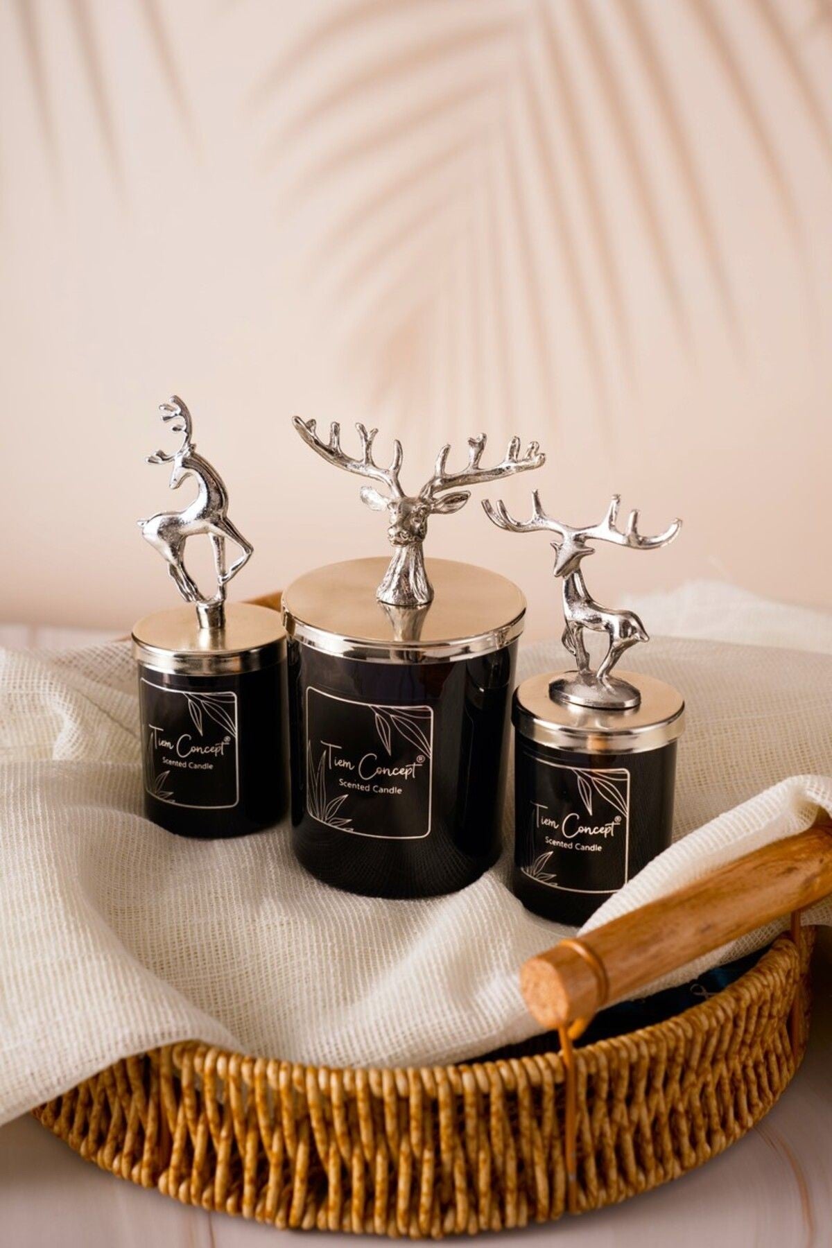 Büyük olan bardakta geyik kafası tepelik ve küçük olan bardakların birinde ayakta geyik diğer küçük bardakta ise geniş boynuzlu geyik tepelik kullanılmaktadır. Mumlarımız Vanilya kokuludur. 3lü set olarak gönderilmektedir.