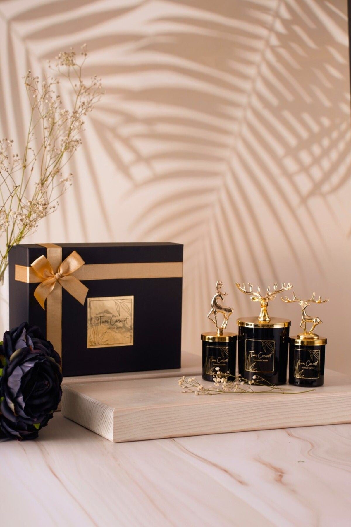 Yılbaşı Dekoratif Özel Tasarım Siyah Kutulu Vanilya Kokulu Gümüş Geyik Tepelikli 3lü Bardak Mum Seti